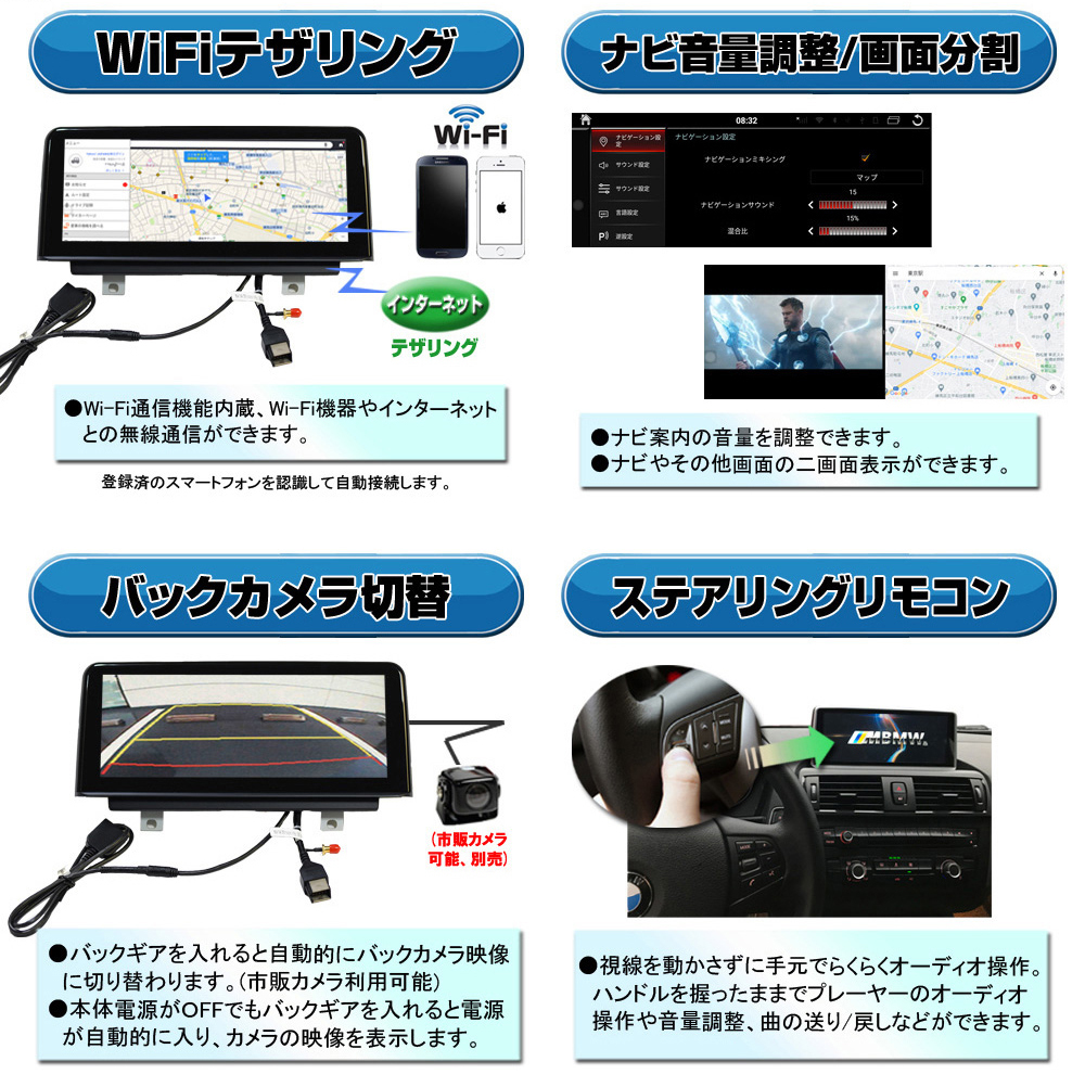 お車元々の機能と互換性があります。 ステアリンクボタン、iDriveコントローラ、パーキングセンサー、バックカメラなど変更なく、使用できます。| 仕様 |