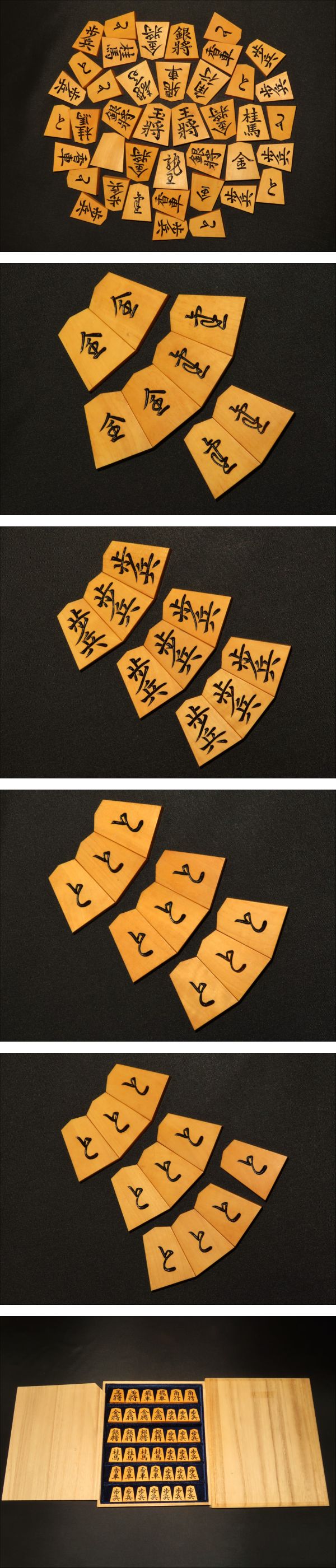木地は御蔵島黄楊。多くの駒は柾目でしたが、わずかに板目も散見されました。全ての駒の表裏をUPいたしましたので是非ご覧くださいませ。