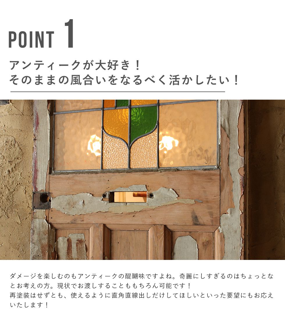 イギリス、フランスを中心にヨーロッパ中から直接買い付けをした本場のアンティーク品となります。 高級なイメージのアンティークですが、当店ではリーズナブルにアンティークをお楽しみい頂けるよう、ステンドグラスは一度に1,000枚以上。アンティークドアも100枚以上を一度に輸入。 全国でも有数の買い付け量を誇ります。 創業以来現在の買い付け量を保つ事で、現地ディーラーとの密な信頼関係を構築。当社に向けてより良い物を提供してもらえる環境作りを維持し、現在では現地取引先約20社と提携しています。 また当店ではアンティークのプロフェッショナルが常駐する工房を完備。修理、メンテナンスはもちろん、ステンドグラス、ドアの制作からカスタムまで、アンティークのご相談はウェリントンにお任せください。 ネットに載っていない商品もまだまだございます。京都伏見のショールームにも是非お越しくださいませ。 ※修理に関するご注意※ ■ 標準修理に関しては別途料金にて承ります。事前に仕上がりサイズを必ずご確認くださいませ。 ■ 標準修理をご依頼の場合、決済確認後の着手となります。恐れ入りますが代引きでのご決済はお断りしております。 |