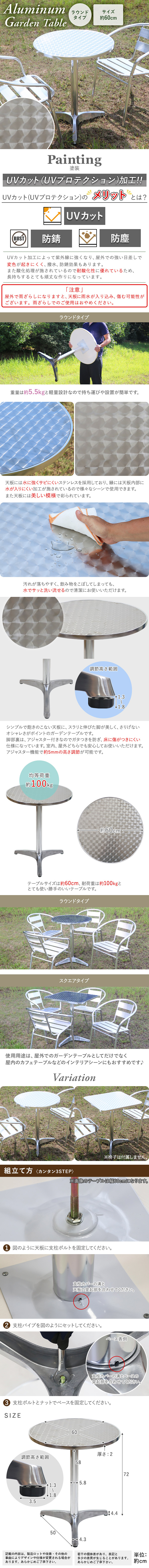 | 商品名 | 送料無料 アルミガーデンテーブル アルミテーブル UVカット 天板サイズ約60cm ラウンドテーブル 軽量 頑丈 コンパクトサイズ シンプルデザイン お手入れカンタン 簡単組立 ガーデン テーブル ステンレス アウトドア 屋外 丸 円形 almgtablel |