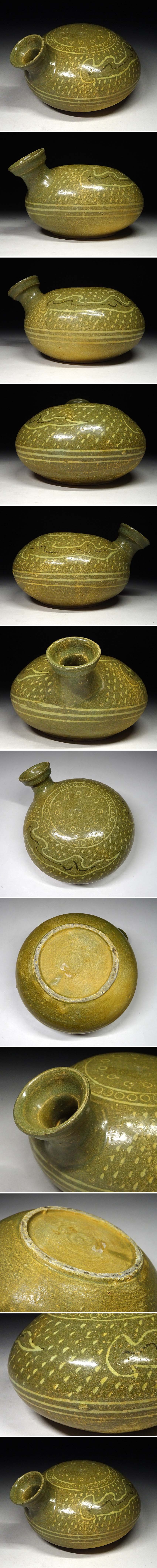 緑屋t■ 朝鮮美術 高麗青磁 象嵌 平瓶 壷 朝鮮古陶 時代物 i9/10-6567/18-2#80 收藏