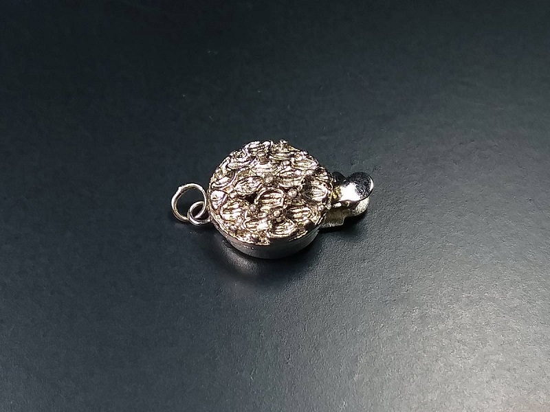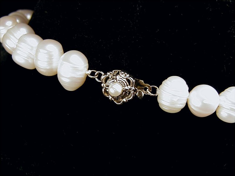 最後の金具(留め具)の写真をご覧下さい。現在、真珠の玉が非常に大きいため、写真で使用してある金具では少し小さく、弱いと思いますので、安全を考慮して最後の写真で掲載の