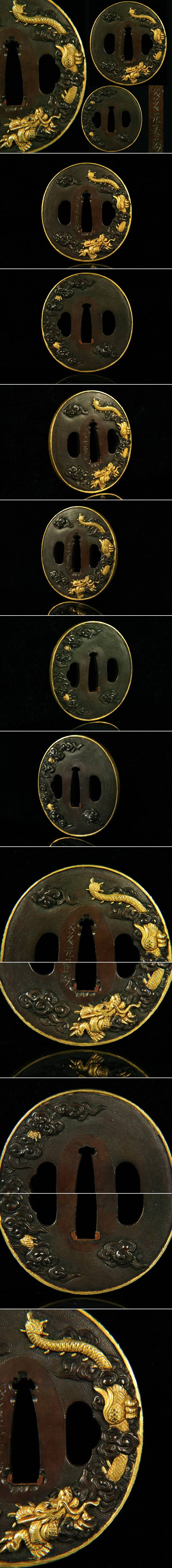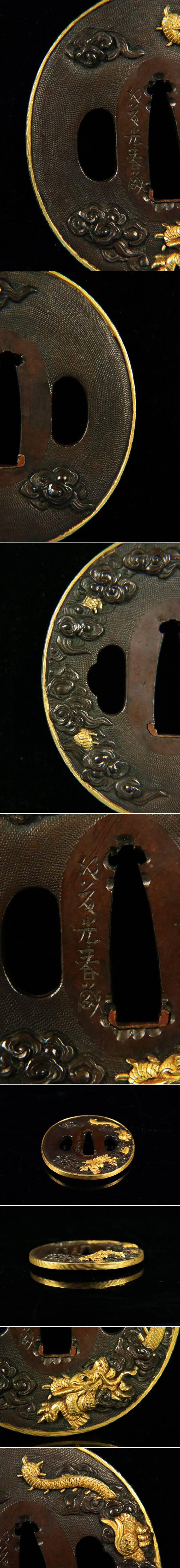 【ASAHI】小道具特集 名門後藤家在銘『後藤光春(花押)』赤銅地雲龍図鋤出彫高彫据紋金色絵両櫃孔丸形鍔[71196qpt] 收藏