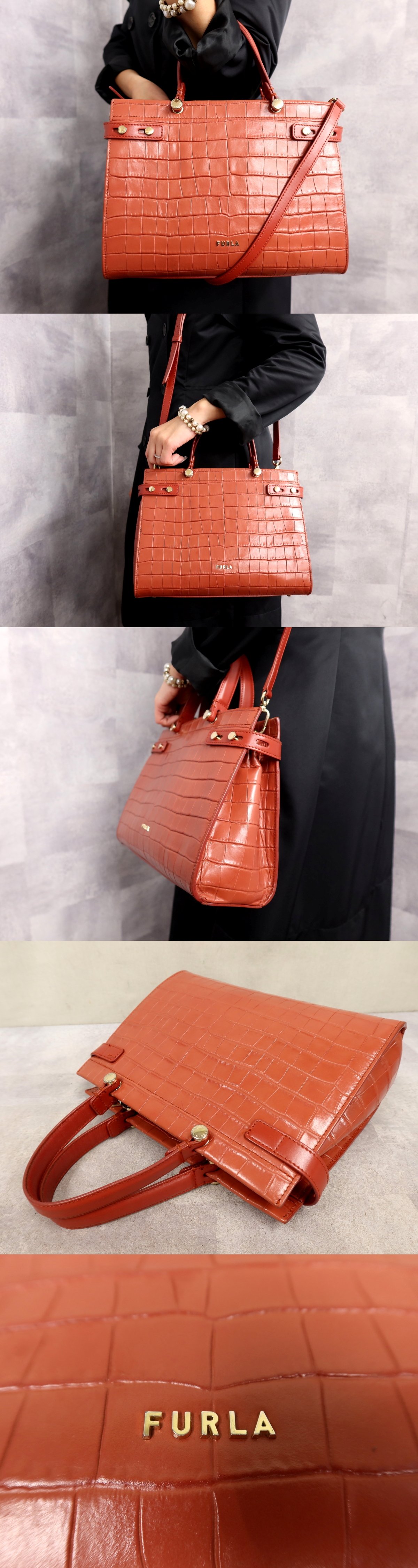 ●超美品●FURLA フルラ●LADY●ロゴ金具●クロコダイル 型押し レザー 本革●2way ハンド バッグ●サーモンピンク●ゴールド金具●Js62869 收藏