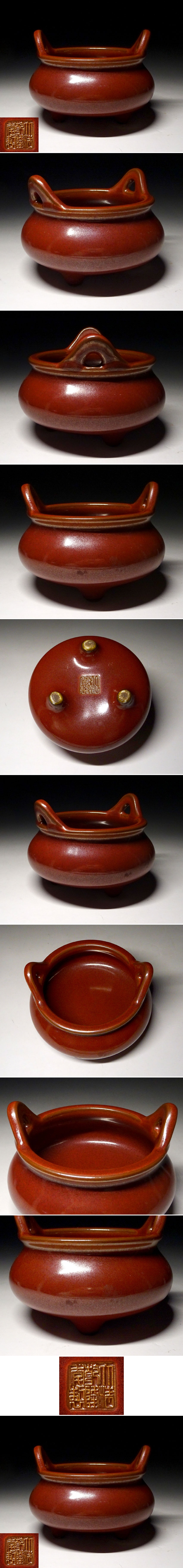 緑屋c■ 中国古玩 辰砂釉 双耳 香炉 大清乾隆年製 唐物 時代物 i9/10-6827/4-2#60 收藏
