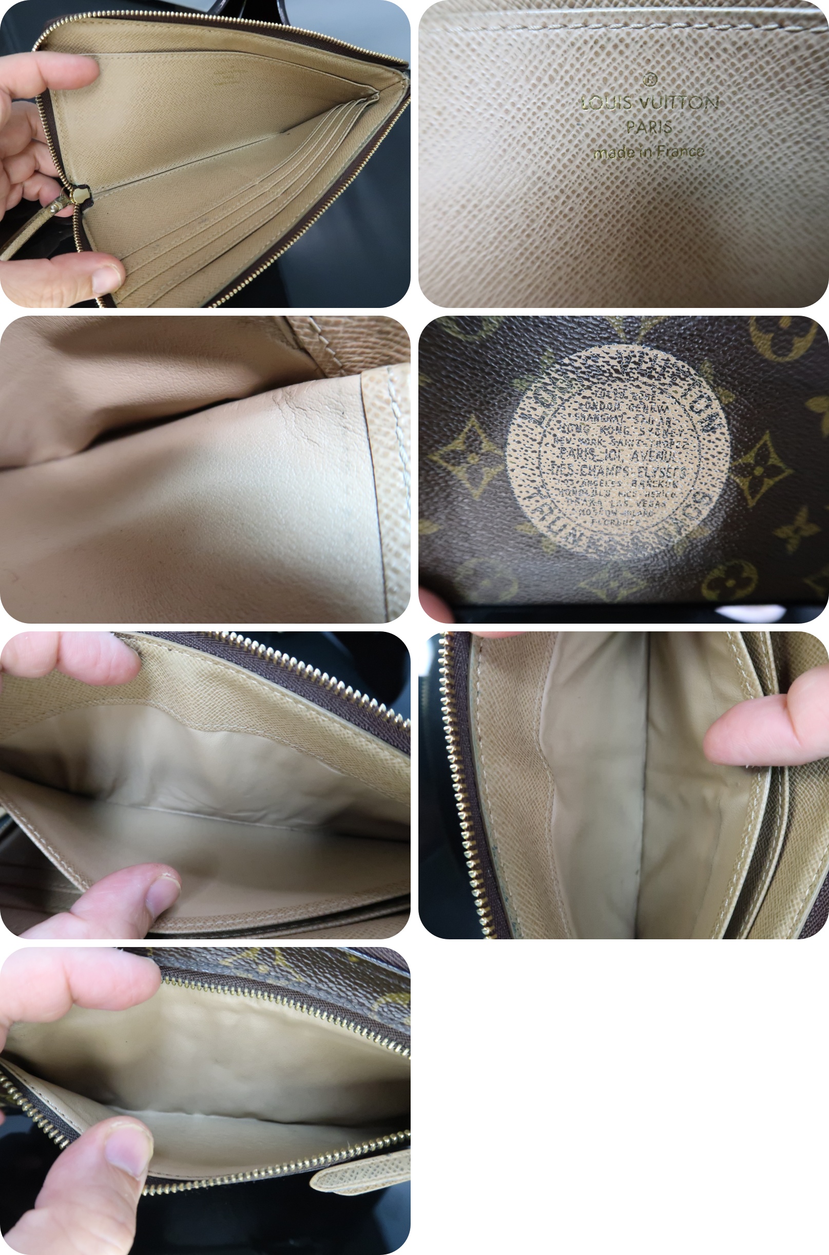 ファスナーを私が交換しております。問題なく開閉可能なコンディションです。 ファスナーの引手に使用感あります。 中央の柄に擦れが見られます。 モノグラム生地の縁取りにひび割れが見られます。 |