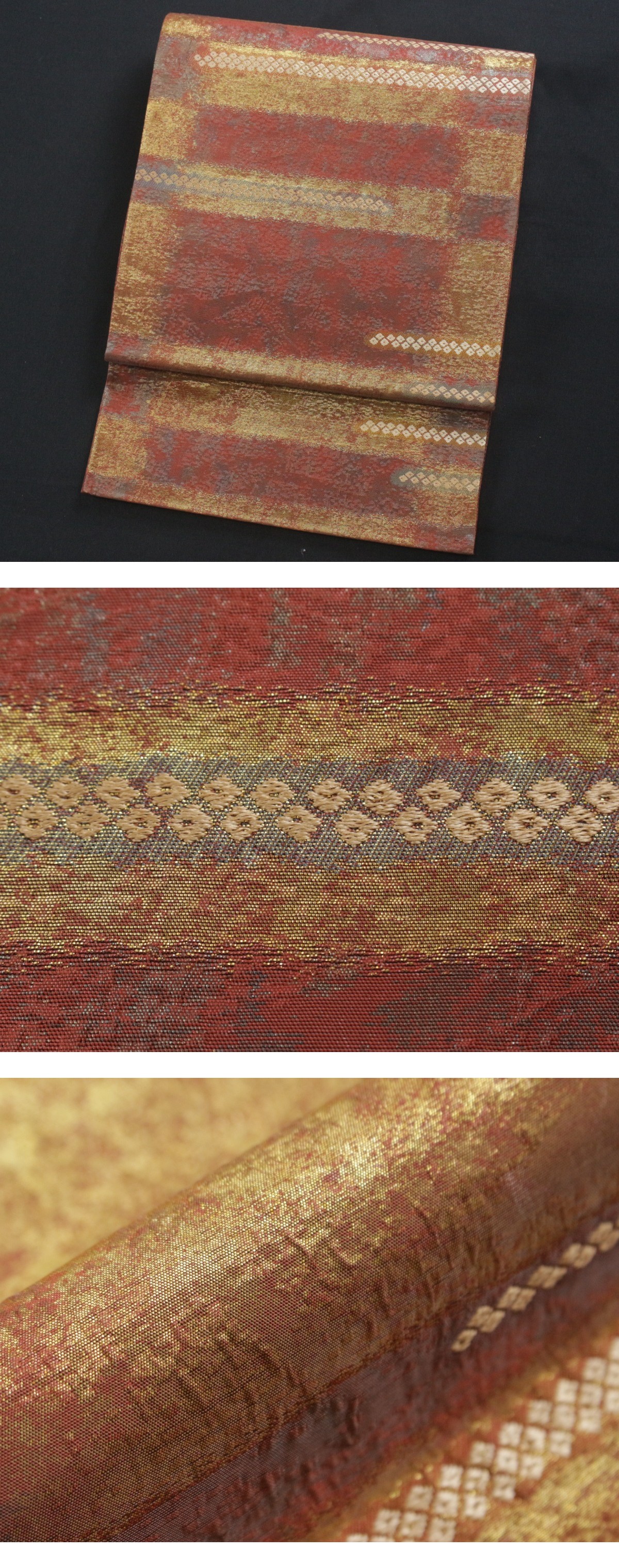 西陣の名門・渡文による用美錦の袋帯のご紹介です。 用美錦とは、渡文が大切にしてきた“用にかなった美”を追求する考え方から生まれた織りで、締め心地の良さと落ち着いた意匠美を特徴とします。過度な装飾に頼らず、素材と織りの質感そのものを楽しめる点が魅力です。 こちらの帯は、金糸の輝きを抑えた深みのある表情に、抽象的な横段文様を配したデザイン。霞がたなびくような揺らぎのある構成が、全体に奥行きと静かな華やかさを添えています。規則性の中に揺らぎを感じさせる意匠は、見る角度や光によって印象が変わり、装いに表情を与えてくれます。 渡文ならではの確かな織りと、用美錦の思想が息づく、品格と実用性を兼ね備えた一条をぜひお楽しみください。 【渡文】 創業明治39年 渡邉文七機業店を創業。 キモノ雑誌にも多く取り上げられ、お着物通なら皆様ご存知の、西陣のお洒落ものの名門でございます。 ※撮影時の部屋の照明によって画像の色に若干の差がございます。色味に差がございますことをご了承のうえご検討下さいませ。 …状態… 締め跡あり。 ※全くの新品ではございませんので、記載のない変色やスレ、ヤケ、その他僅かな難がある場合がございます。そのような理由でのキャンセルはお受けできませんので、ご了承の上ご検討お願いいたします。 |