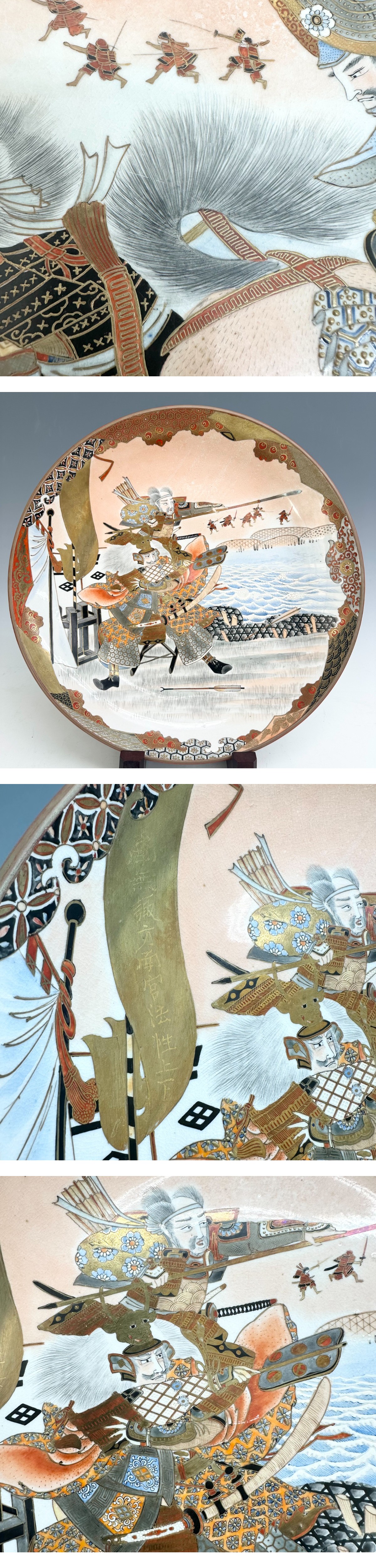 ●時代 九谷製 梅月堂 棋月画 色絵金銀彩 本盛絵「川中島合戦之図」大飾皿 直径約37㎝ 二枚 時代箱付