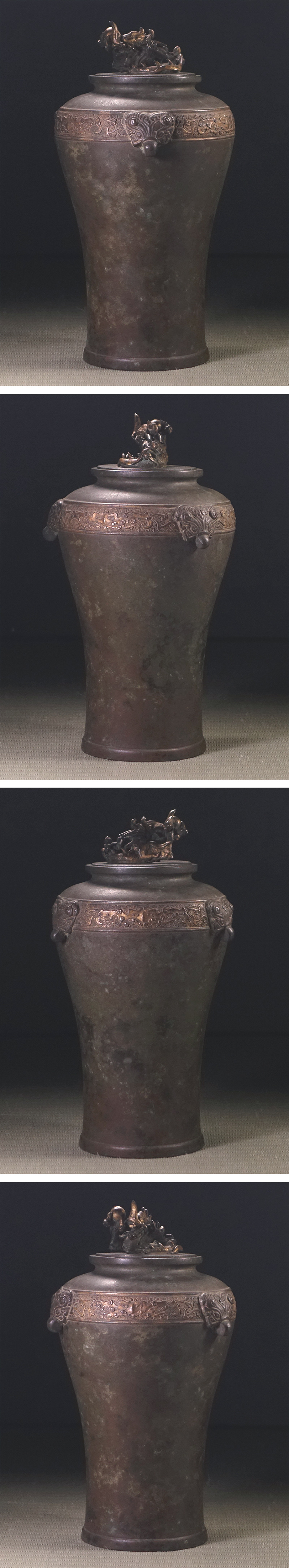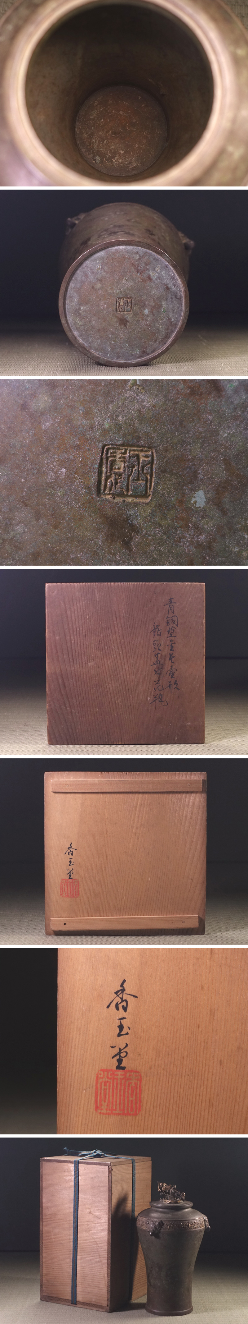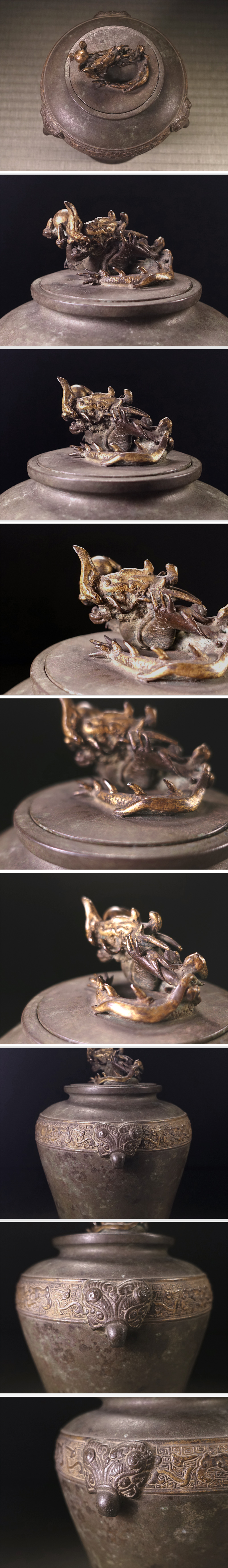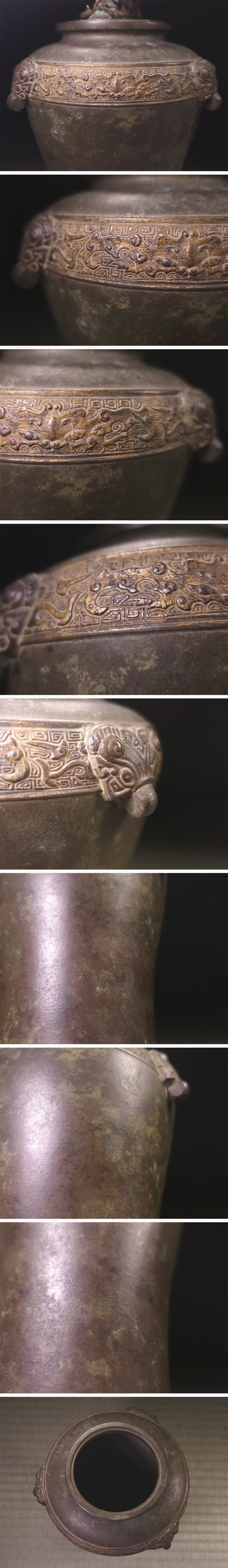 ∇花∇【香玉堂】製 青銅塗金饕餮紋龍頭蓋付花瓶 共箱付 古代中国青銅器を模した秀作 收藏