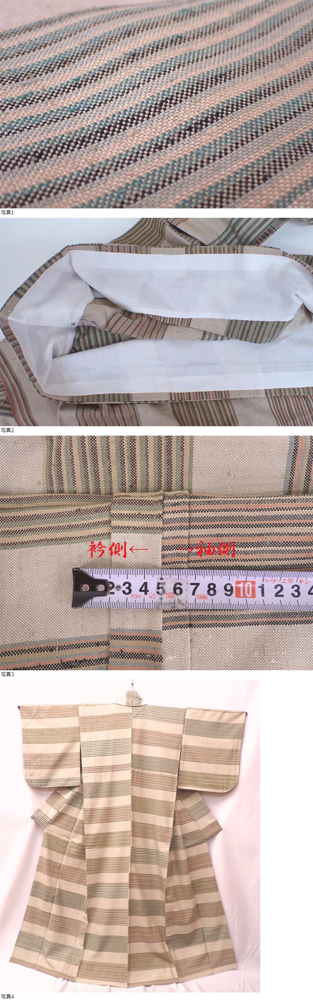 秀品 ウールのお着物 身丈159.5cm(+2.5cm) 裄丈66.5cm 横段文 麻色 胴抜き 八掛正絹 カジュアル着 | ||||