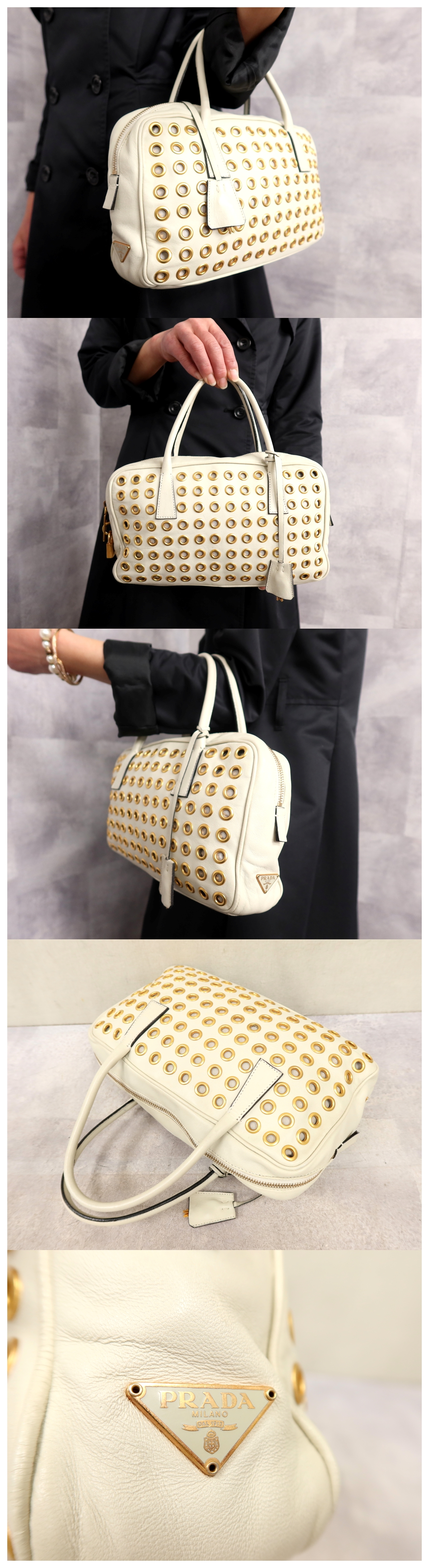 ●超美品●PRADA プラダ●三角ロゴプレート●ハトメ●カーフ レザー 本革●ハンド バッグ●アイボリー●ゴールド金具●イタリア製●Js64234 收藏