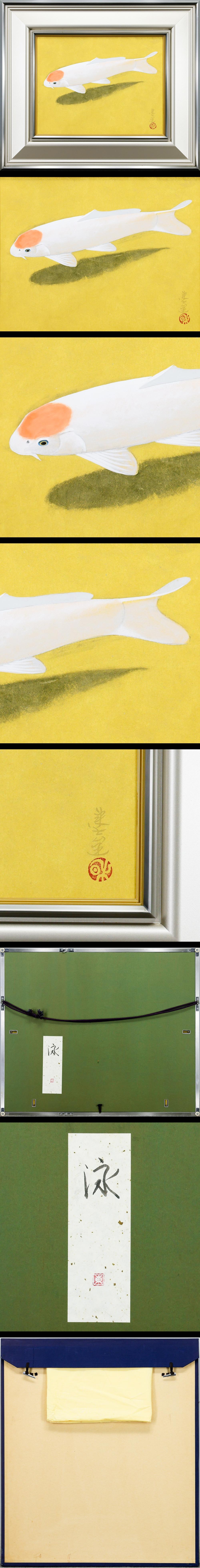 【真作】【WISH】室井東志生「泳」日本画 6号 共シール ◆金地に白影ひとすじ 静かな泳ぎ 〇日展理事 師:橋本明治 #25123543 收藏