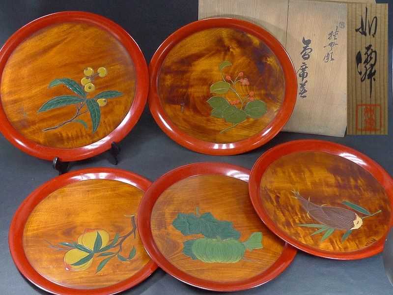 14AM177★讃岐彫 植田如僊造 彩色木彫草花野菜果実文変わり丸盆 会席膳 5客揃 共箱付き 桃・筍・南瓜他 5枚セット 收藏
