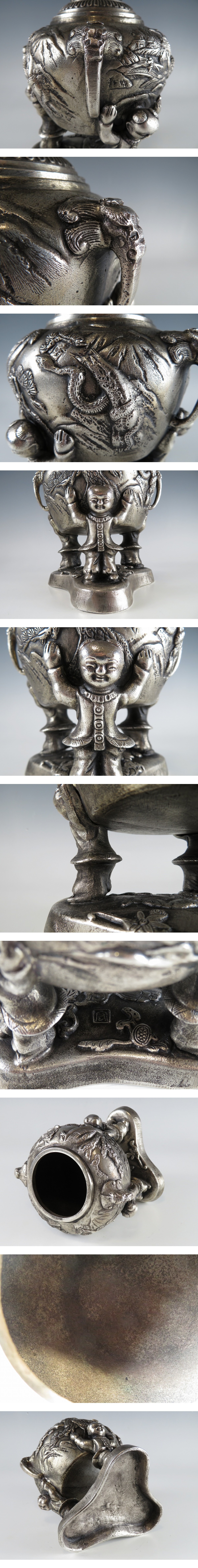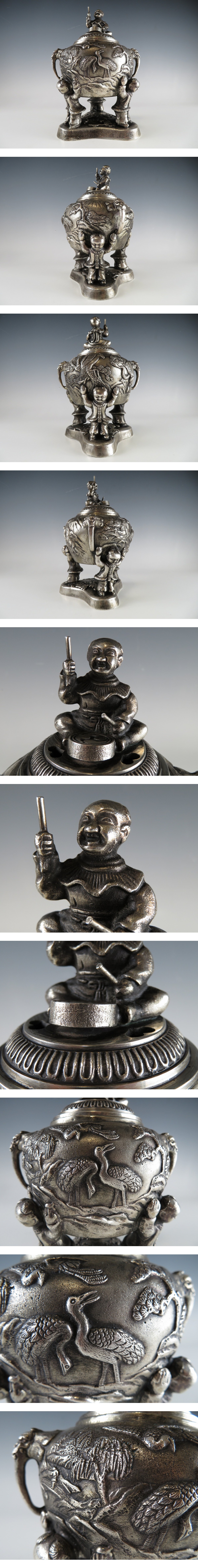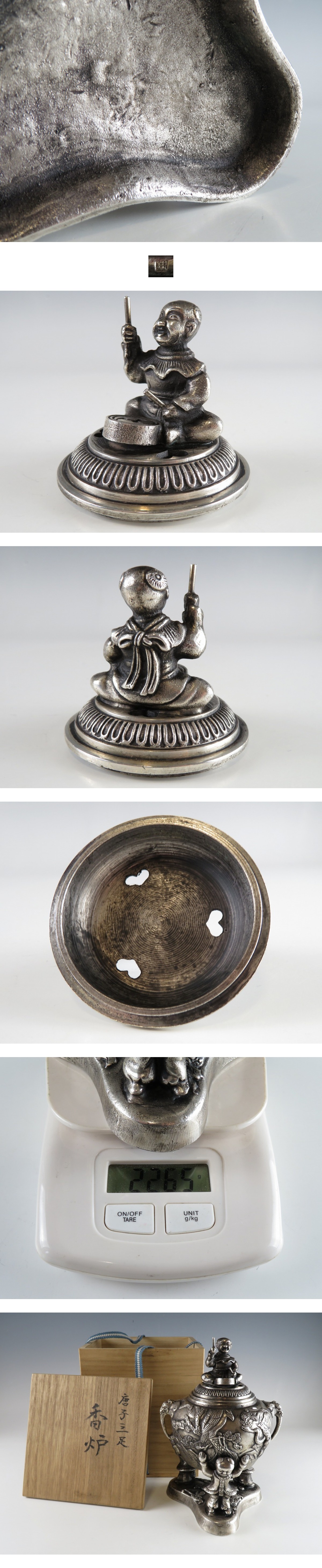 | ☆ 仏教美術 銀刻印 時代金工 高肉 唐子 三足 香炉 約 2.2 kg になります。 ※ 素材については銀の刻印は御座いますが、鑑定を行っていない為に純度は不明です。あらゆる可能性を考慮の上、ご納得頂きオークションご参加下さい。 |