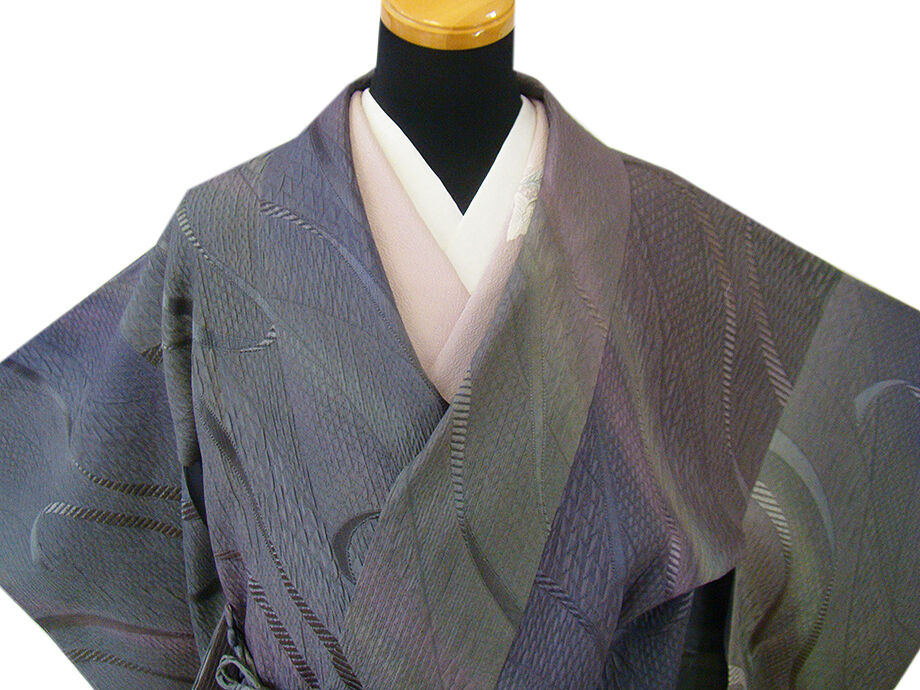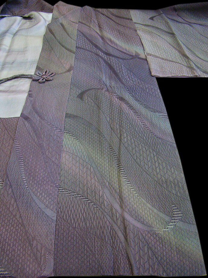 渋い藤鼠、紅藤、青緑色等のぼかし地にフクレ織。