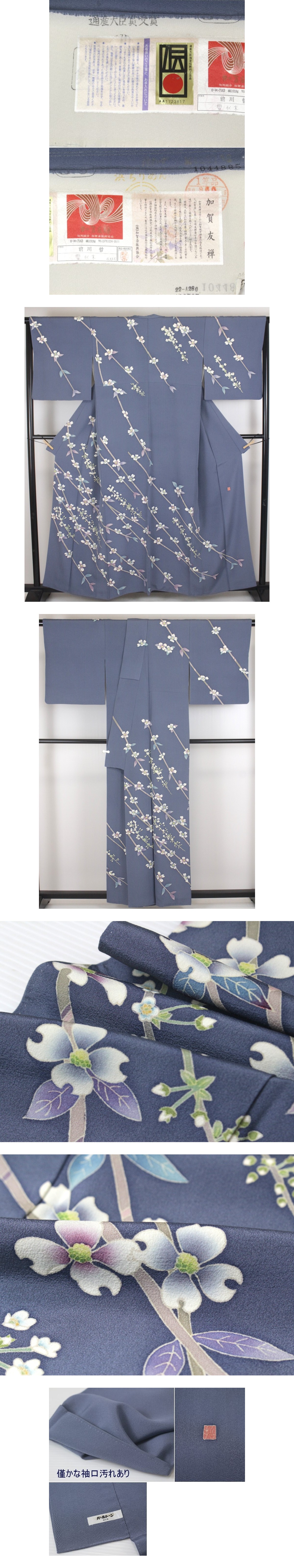 伝統工芸 加賀友禅 前川哲 作 訪問着のご紹介です。 加賀友禅ならではの写実性と、落ち着いた色彩感覚が美しく調和した一枚。 やや青みを帯びた上品な地色に、斜めに伸びる枝花文が配され、控えめでありながらも洗練された存在感を放ちます。 加賀友禅の特徴である ・糊糸目による柔らかな輪郭 ・ぼかしを活かした自然な陰影 ・金彩に頼らない染めの美しさ が随所に感じられ、作家の確かな技と感性がうかがえます。 文様は全体に流れるように配置されており、着姿ではすっきりとした縦のラインを演出。 華やか過ぎず、上品さを大切にしたい場面にふさわしい訪問着です。 観劇やお食事会、趣味のお集まりなど、幅広いシーンで活躍する一枚。 伝統工芸としての価値と、日常に寄り添う実用性を兼ね備えた、加賀友禅の魅力を存分にお楽しみいただけます。 ※撮影時の部屋の照明によって画像の色に若干の差がございます。色味に差がございますことをご了承のうえご検討下さいませ。 …状態… 状態良好(袖口僅かに汚れ) ※全くの新品ではございませんので、記載のない変色やスレ、ヤケ、その他僅かな難がある場合がございます。そのような理由でのキャンセルはお受けできませんので、ご了承の上ご検討お願いいたします。 |