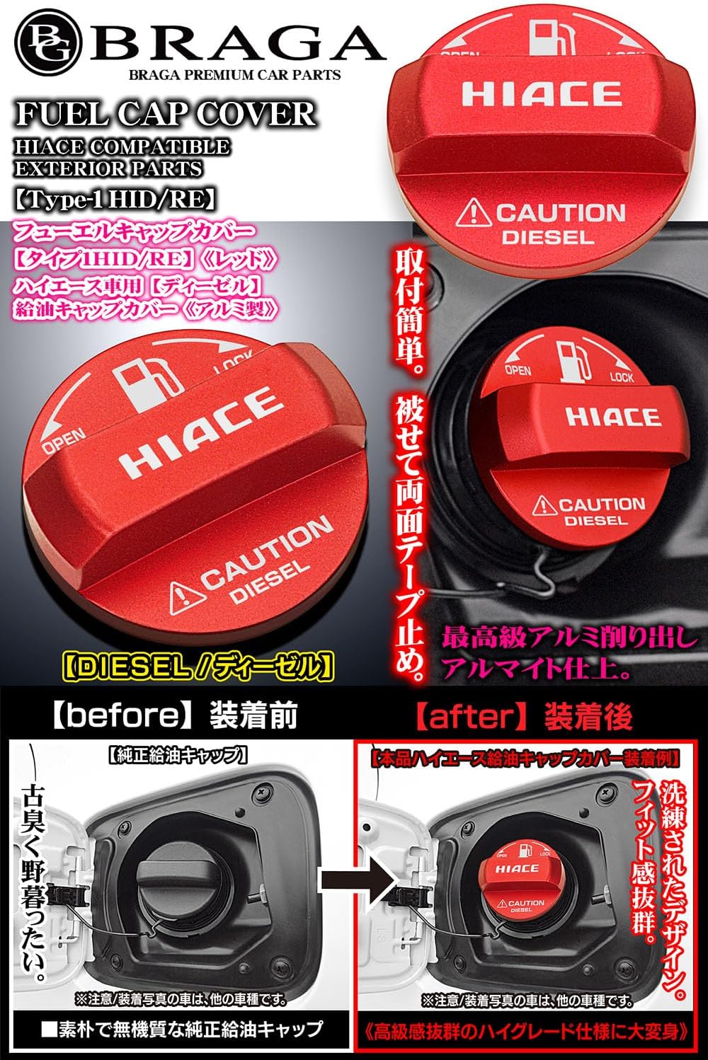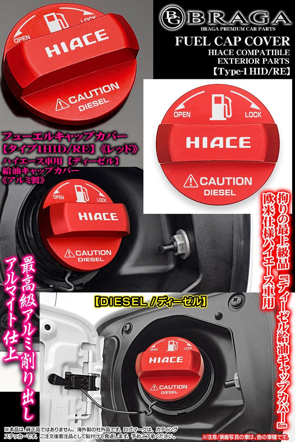 [タイプ1HID/RE]ハイエース ディーゼル/HIACE DIESELステッカー付/給油 フューエル キャップカバー/アルミ製/レッド/客注/ブラガ BG BRAGA