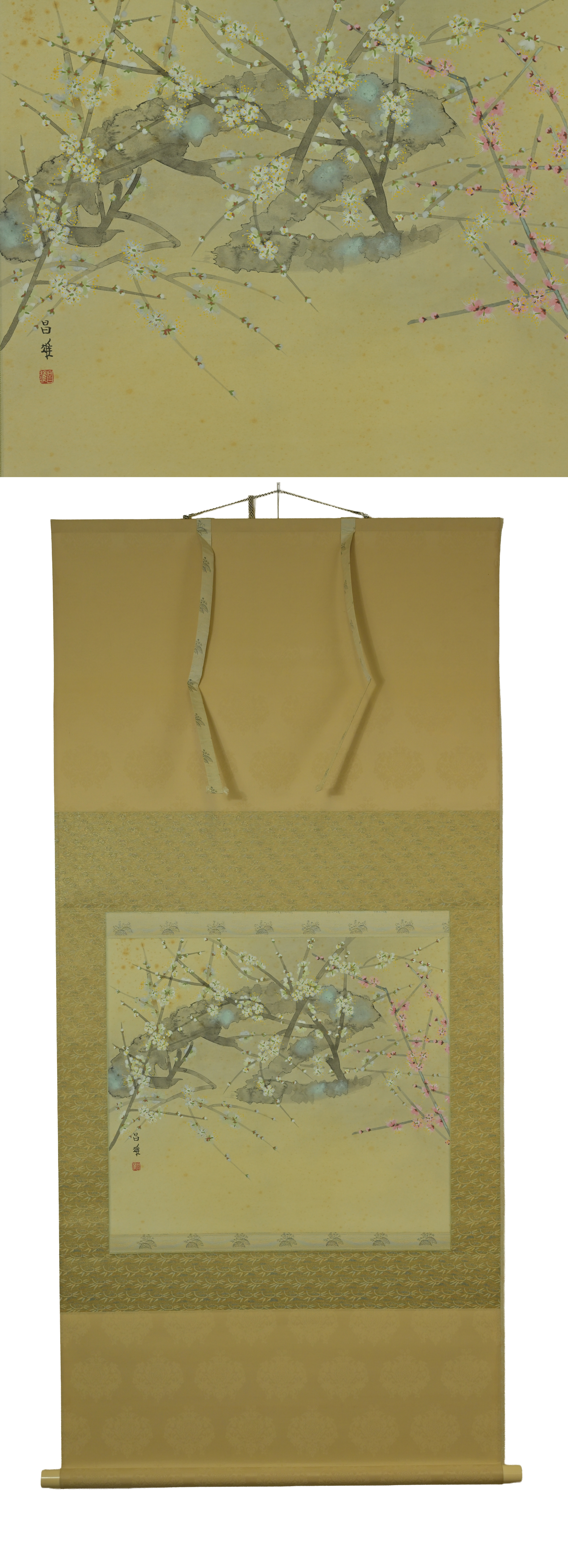 | ご覧いただきありがとうございます。 ・寸法 全長 約144cm×72.5cm 本紙 約44.5cm×51.5cm ・状態 絹本・肉筆 全体に小シミがあります。 | |