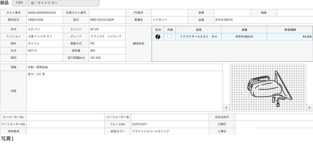 H27年 S321V ハイゼット デラックスハイルーフ 右 ドアミラー 塗りなし黒 /送料 ミニ/905344 收藏