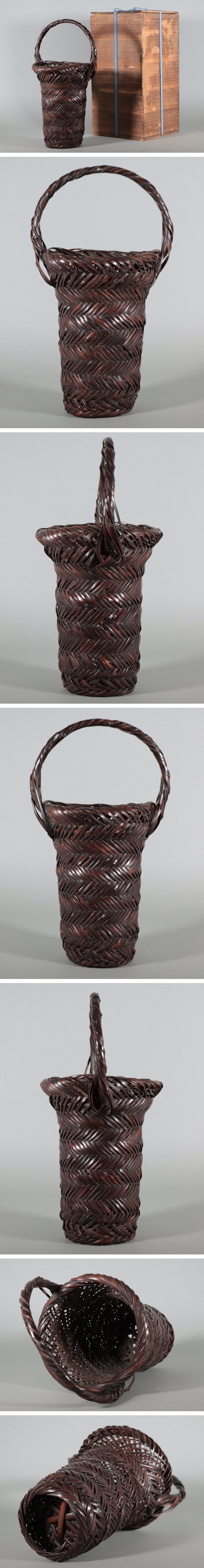 竹芸家 鈴木玩々斎 玩々斎 / 紫竹芭蕉編 朱廣 花籃 共箱 / 古竹造 煤竹 竹編 花籃 花籠 / 花器 花瓶 花入 花生 華道 華道具 / 高さ42cm 收藏