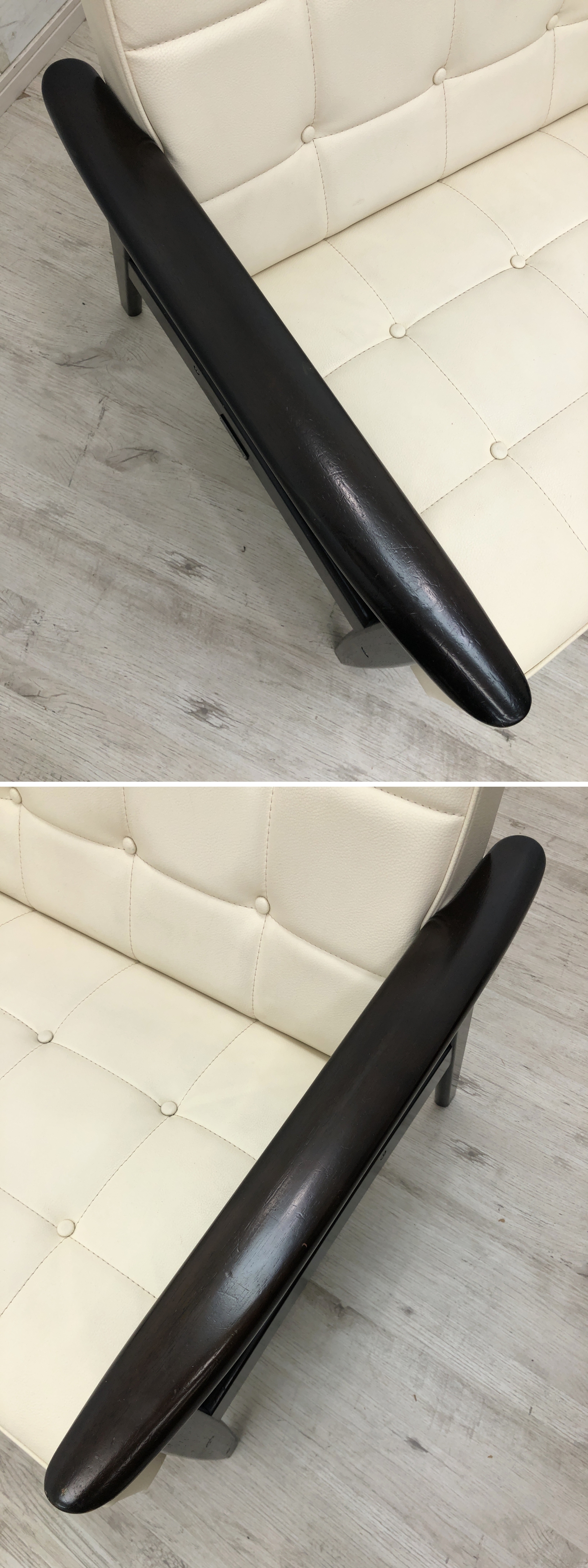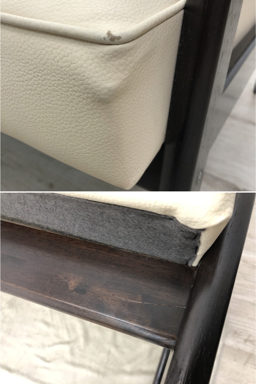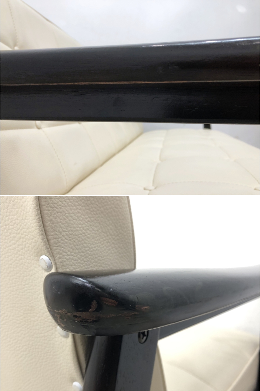 こちらはカリモク60 Kチェア 2シーター スタンダードアイボリー です。 中古品です。 日本を代表する老舗家具メーカー・カリモクが手がける、ロングセラーの定番モデル。 直線的で無駄のないデザインと、木製アーム×ボタン留めの座背面が特徴です。 流行に左右されない普遍的な佇まいで、リビングはもちろん、 応接スペースやサロン空間などにもよく映えます。 張地はスタンダードアイボリー。 やわらかく上品な色味で、お部屋全体を明るく見せてくれます。 ブラックとは対照的に、軽やかで清潔感のある印象。 ナチュラルテイストや北欧系インテリアとも相性の良いカラーです。 2シーターは日本の住空間に取り入れやすいサイズ感。 圧迫感を抑えながら、しっかりとくつろげるバランスの良い一台です。 お探しの方、この機会にぜひご検討ください。 【カリモク60について】 カリモク60は、日本の老舗家具メーカー・カリモクが、 1960年代に誕生した名作家具を現代の暮らしに合わせて再構築したブランドです。 簡潔で無駄のないデザイン、修理や張替えを前提とした堅実なつくり、 長く使い続けられる品質の高さが評価され、世代を超えて親しまれています。 中でもKチェアは、カリモク60を代表する定番モデル。 ミッドセンチュリーの趣を持ちながら、日本の住空間にも自然に馴染む佇まいが魅力です。 使い込むほどに味わいが増し、暮らしに静かに寄り添う そんな価値を大切にしたい方に選ばれている、国産家具ブランドです。 【コンディションについて】 詳細につきましては下記画像も合わせてご参照ください。 ![]() 【左右の肘掛】 ![]() 【肘掛け向かって左側面のキズ/先端の擦れキズ】 ![]() 【座面角のスレと凹み/前桟(シート下部前方にある横木)にヒビ割れ(表面)】 ![]() 【前桟(シート下部前方にある横木)にヒビ割れ(裏面)】 ![]() 【背面角のスレキズ/座面端のスレ】 使用に伴い、張地に若干のくすみ、木部にスレ、張地の角にダメージが見られます。 前側バーの座った際に左側にヒビを確認しております。こちらは木同士が開く気配はありませんでしたが、念のため弊社にて 隙間にボンド水を塗布して補強しております。 クッション性は維持されています。 中古ソファにありがちな匂いは感じられませんでした。 是非この機会にご検討ください。 皆様のご入札をお待ちしております! セット可能な同シリーズの家具を同時出品中です!(2026/01/30現在)
