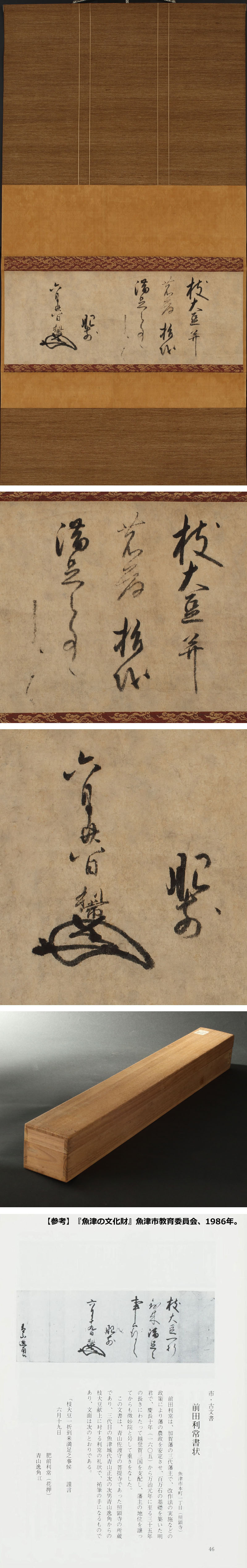 前田利常の書状です。 枝大豆および茗荷の献上を喜ぶ書です。『魚津の文化財』(魚津市教育委員会、1986年)にほぼ同内容の利常の発給文書が存在し、加賀藩士(のち富山藩士)青山逸角に宛てた書と推察されます。 青山逸角はもと魚津城代を務めた青山正次の二男で、芳春院(まつ)の縁者にあたり、前田綱紀の養育係を務めた青山吉隆(将監)の弟に当たります。魚津城の破却後は金沢へと移転しましたが、寛永16(1639)年、利常の隠居に伴い新たに富山藩士へ分属されたことが知られます。本作の利常花押も寛永15(1638)年~同19(1642)年のものと推定され、綱紀誕生以前、富山藩成立前後に青山家と交渉があったことが窺わせます。 貴重な逸品です。 ◆前田利常 江戸前期の大名。前田利家の四男。慶長6(1601)年将軍徳川秀忠の娘子々姫と結婚。同10(1605)年兄利長の隠居で加賀金沢藩主前田家三代となり,松平姓をゆるされる。一時幕府から謀反の嫌疑をうけた。寛永16(1639)年長男光高に家督をゆずり,次男利次を富山藩に,三男利治を大聖寺藩に分封。5代藩主綱紀を後見し,農政改革のため改作法を実施。万治元(1658)年没、66歳。初名は利光。 ◆青山逸角 江戸前期の武士。加賀金沢藩士。魚津城代青山正次の二男。寛永16(1639)年前田利常隠居に伴う前田利次への分封により富山藩士に配せられる。 〔本文〕 枝大豆并 茗荷指越 満足之事候 かしく 肥前 六月廿八日 利常(花押) 付属:時代箱が付属します。 寸法:高さ101cm、幅49cm(最大幅。若干の誤差はご了承下さい) 状態:経年によるイタミがございます。 |