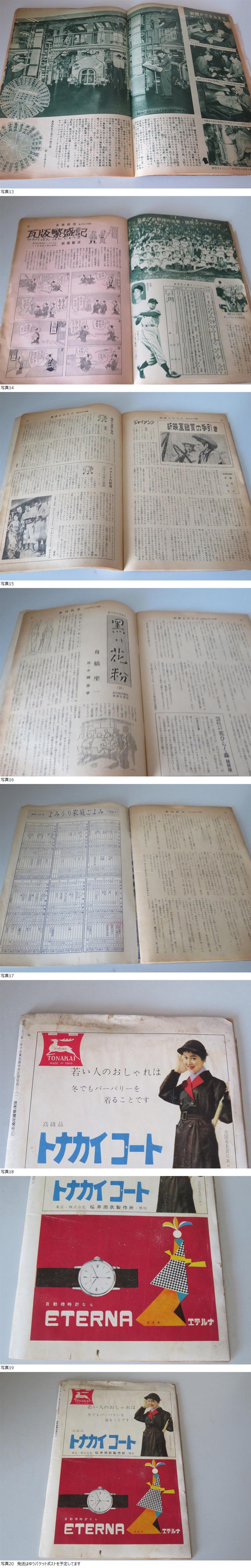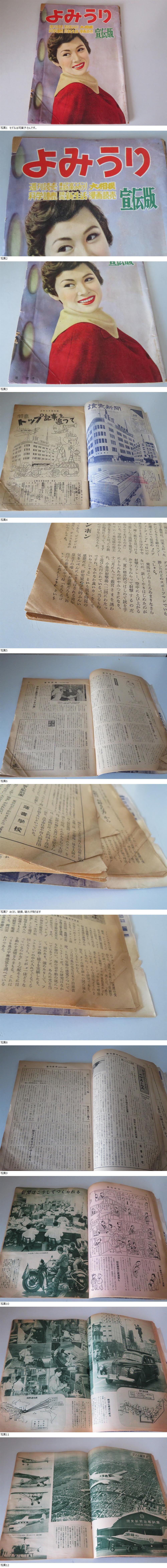 ※◎【本文の解説をよく読まれてご検討ねがいます。】 誠に申し訳御座いませんが24時以内に連絡、ご入金処理のできる方、および商品受領、確認後に取引ナビにて早急に「受取連絡」のできる方のみ入札願います。 また、評価が新規の入札者様は入札の際、質問等で予め連絡ください。事前連絡がない場合はこちらで入札の取消(削除)を実施しますことを予めご了承願います。 商品名 :★ 昭和レトロ よみうり 宣伝版 【現状品(イタミあり)】★ 付属品 :なし。 商品詳細 :昭和32年発売の「よみうり」読売新聞社発行の週刊誌等の宣伝版です。 長期保管による経年劣化(ヤケ、ヤレ、シワ、めくれ、破損)等がありますがなんとか読むには問題なさそうです。 不要のため処分します。他に見落し等はご容赦願います。 何方かご興味、必要のある方宜しくお願いします。 外観の詳細は商品説明欄に写真をアップしましたので参照願います。 当方禁煙者ですのでタバコ臭はございません。 当該商品の内容については答えられない場合がありますので予めご了承下さい。 それでもご不明な点等がございましたら答えられる範囲でお答えします。 説明文の理解力の無い方、思い込みの激しい方はくれぐれも入札しないで下さい。 ほかの新品等保証の有るものをお探しください。 説明文をよく読まれた上、入札頂けます様お願い申し上げます。 入札終了間近のご質問もお答えできませんのでご了承下さい。 発送方法は日本郵便のゆうパケットポスト等を予定してます。 以上宜しくお願いします。 |