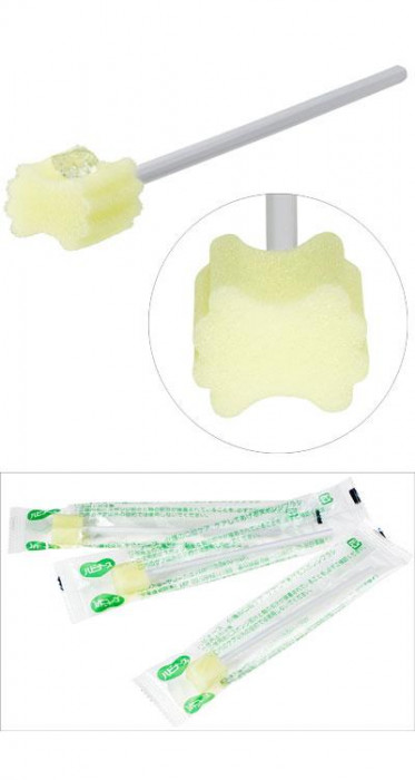 | リボン状のスポンジで、おくちの汚れが落としやすくかき出しやすい。軸は水に強いプラスチック製。元は断面六角形で操作しやすく口元は円形状になるので口あたりがやさしい。汚れ落とし・ジェルの塗布に適したスポンジの硬さ。汚れを取りやすい凸凹形状。口腔保湿ジェルを乗せやすいジェル溝。 |