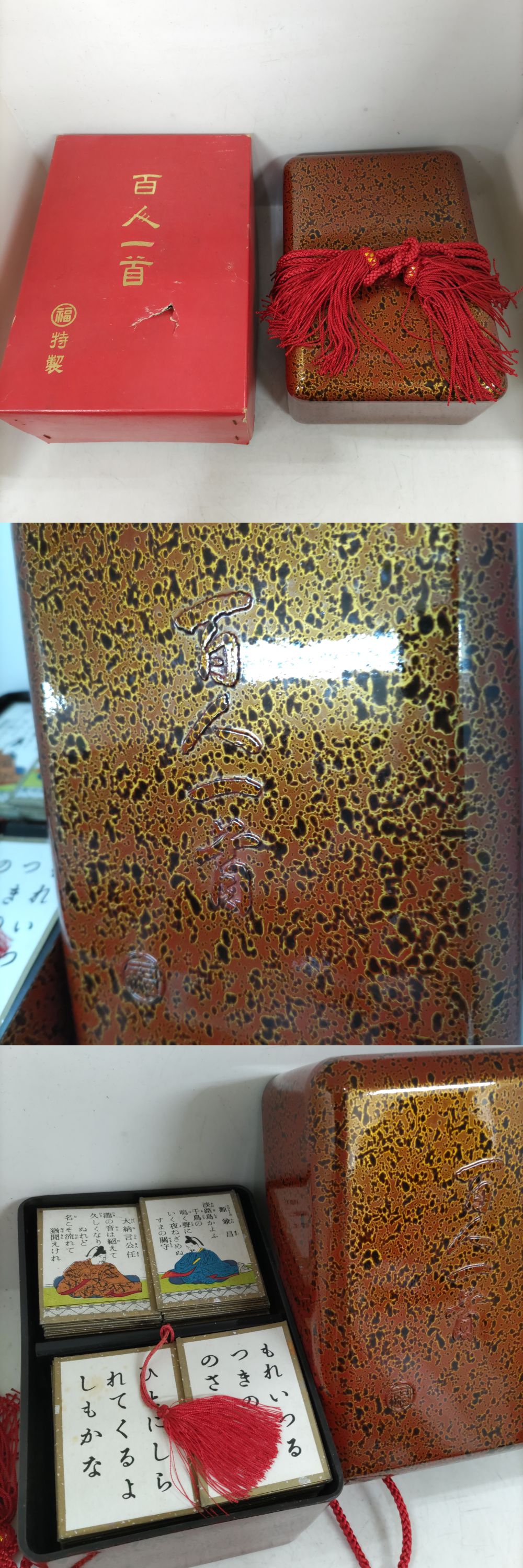 | ※必ず最後までお読みください。 Please be sure to read to the end. 一定要到最后※ | 商品概要 | 数あるオークションの中からこちらの商品をご覧頂きまして誠にありがとうございます! ※商品説明と注意事項を必ず全てお読み頂いた後にご入札下さい※ 引き続き 安心できる気持ちの良いお取引を心掛けてまいりますのでどうぞ 宜しくお願い致します! 色んなジャンルの商品を多数出品しておりますので、こちらをクリックしてご覧ください!! 東京都公安委員会 古物商許可 第307781505147号 ◎任天堂◎丸福 特製 百人一首 希少 唐塗箱 即発送 ※最下部にも写真掲載中なので必ずご覧下さい。 【商品概要】 「丸福 特製 百人一首」は、世界的なゲームメーカーである任天堂が、その前身である「丸福」ブランドで製造・販売していた伝統的なかるた製品です。 任天堂は1889年に花札の製造から始まりましたが、かつては「丸福任天堂かるた」などの社名を用いており、「丸福(まるふく)」は同社の歴史ある屋号・ブランド名です。 「特製」の名にふさわしく、唐塗箱入りの希少なお品になります。 お探しの方、是非この機会にいかがでしょう(^_-)-☆♪ 【状 態】 写真をよくご確認お願い致します。外装ランク:(AB) 【詳細・備考】 写真に写っているものが全てになります。 また、タイトルや本文と写真が異なる場合は写真を正とします。 保管品なので状態判断には個人差があることを予めご了承の上 写真にてご確認ご判断をお願い致します。 譲り受けたお品で当方は専門店ではないので詳細の質問にはお答えできかねます。 また簡単な検品は行っていますが、譲り受けた商品のため欠品等見落としがある場合がございますので保証等はしかねます。 ※返品不可が入札条件となります。 ※中古現状とは動作未確認のジャンク品になります。 ※通電確認とは電源に繋げてONOFFの確認のみになります。 ※バッテリーや電池は消耗品なので経年劣化がある場合もあることをご了承お願い致します。 ※保管品に関しては未使用でも新品ではございませんので、保管期間による劣化等ある場合もございますので、新品をお求めの方はご入札をお控えください。 ※ジャンク品ではなくても中古品の性質上、配送途中や到着後に万が一不備不良が起きうる場合もございますがも保証はできかねますので、返金返品不可をご了承の上ご入札お願い致します。 ※未開封品に関しては中の状態が不明な為、不具合等ございましたらメーカーとご相談お願い致します。保証対象外とさせて頂きますのでこちらでは対応いたしません。 尚、実際の色とパソコンや携帯の画面を通じた色彩は異なる場合もございますのでお気をつけ下さい。 =外観ランク表記= (N)長期保管/未使用品(新品ではございません) (S)数回程度使用の美品 (A)多少の傷、若干の使用感がありますが程度良好の美品 (B)一般的な使用感あります。 (C)汚れ、使用感を感じるがまだまだ使える品物 (D)汚れ、使用感等が見受けられる難有品 (E)ジャンク品 ※大体の目安としてお考え下さい。 新品に近いものをご希望の方や神経質な方のご入札はご遠慮下さい。 ご入札頂いた時点で本文説明文に了承を頂き、商品にご納得して頂いたと当方で判断させて頂きますので 【ノークレーム・ノーリターンがご入札の条件となります】 また、弊社のオークションでは いろんなジャンルで多数出品しておりますので是非ご覧ください(^_-)-〇 ![]() ▶入札の取り消しは受け付けておりません。 落札後の質問やキャンセルも受け付けておりません。 尚、営業時間が9-18時となっておりますのでオークション終了間際や質問内容によっては返答できない場合がございます。 ジャンク商品に関してはいかなる場合も返品返金の対応はできかねます。 落札後のサイズ違いやイメージ違い等のキャンセル、クレーム、返品等はお受けできませんので予めご了承ください。 ご入札の方につきまして、当方にて評価が著しく悪いと判断した場合は、トラブル防止の観点からご入札を取り消させていただく場合がございますので予めご了承ください。 新規IDの方や、いたずら入札と判断した場合、入札削除させていただく場合がございますので、新規の方は質問欄にて購入意思を示してからのご入札をお願い致します。 ※の障害等で入札が不適切に成立した場合は落札された場合でも削除対象になりますことを予めご了承お願い致します。 取り置きは可能ですが物や金額によってはすぐに決済をお願いする場合がございます。 当方大量の商品を管理している為、複数落札の同梱ご希望の方は、「まとめて取引」の依頼を必ず行ってください。 ◆連絡方法◆ ▶当方連絡事項は全て取引ナビを使用しております。 ご連絡先、ご要望等は必ず「取引ナビ」にご入力お願い致します。※ご入札前の場合はdiamonds100ct@yahoo.co.jpまでお願い致します。 ⇩⇩下記の注意事項を必ずお読み下さい。⇩⇩ |