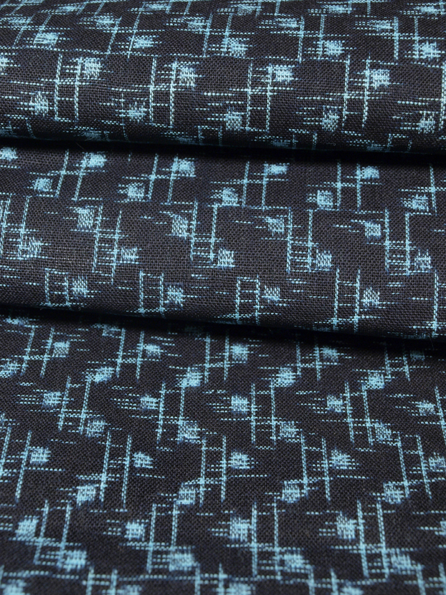 濃藍色の地に、絣で幾何学的な山路の文様が織り込まれている、藍絣のはぎれです。 昭和初期ごろにつくられたアンティークのお品です。おそらく残布と思われ、使用感はありません。画像のとおり、左右にごくうっすらと黄変している部分が 3-4 か所ありますが、ほとんど判別はつきません。 |