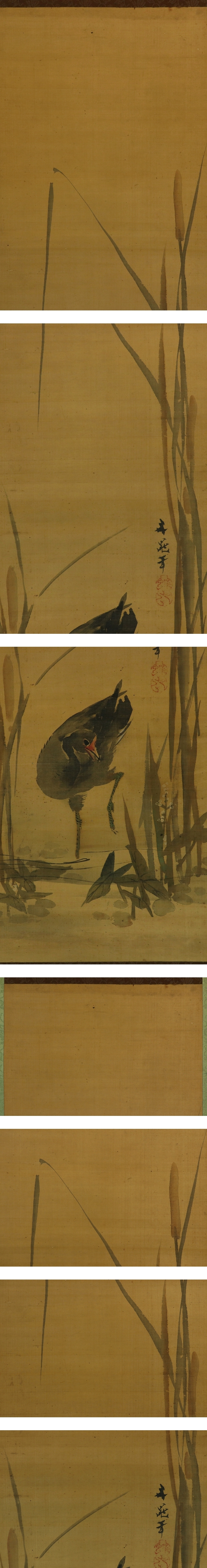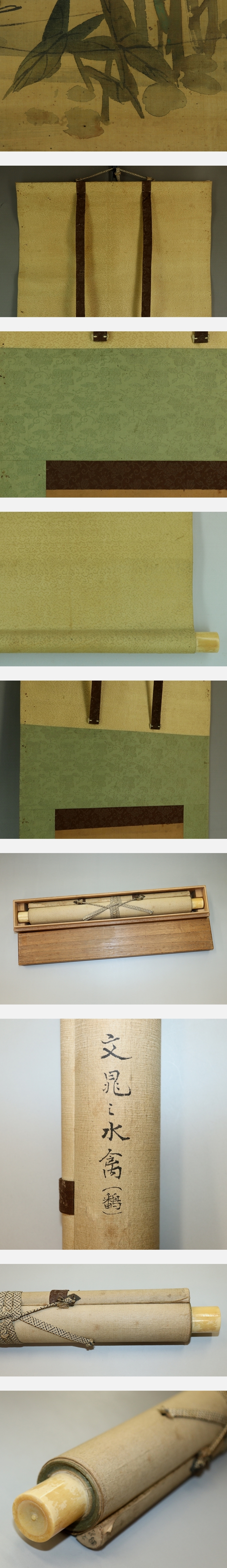 谷文晁 たに-ぶんちょう(1763-1841) 江戸時代後期の画家。 宝暦13年9月9日生まれ。谷麓谷の長男。加藤文麗,渡辺玄対らに師事。 狩野派,土佐派,南宗画,北宗画,西洋画などの手法を取り入れて独自の画風を創出, 江戸文人画壇の重鎮となる。田安徳川家に仕え,松平定信編「集古十種」の挿絵も描く。 渡辺崋山ら門人多数。天保11年12月14日死去。78歳。江戸出身。 通称は文五郎。別号に写山楼,画学斎など。 本紙は、染み、汚れ、虫食い痕、ヤケがあります。 表装は、染み、汚れ、軽い皺、ほつれ、破れ、剥れ、軸先に汚れがあります。 【サイズ】 作品 横約26cm×縦約98cm 表装 横約38cm×縦約187cm |