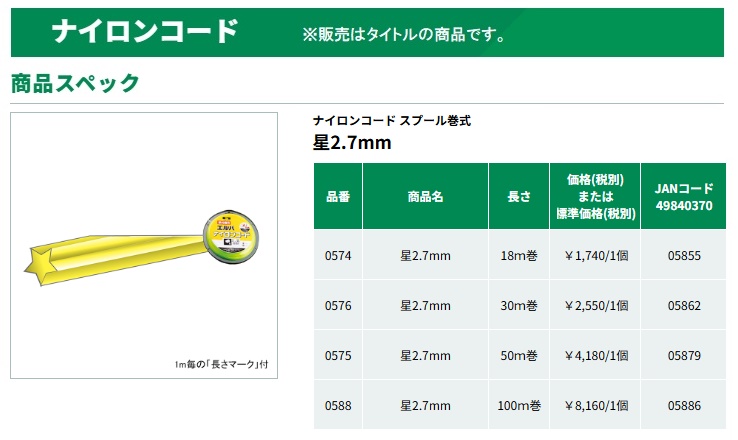 三陽金属 SANYOMETALナイロンコード スプール巻式 角2.7mm 18m巻品番:0574