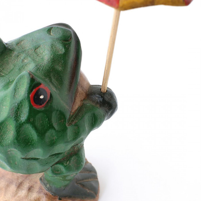 | ぽてっとしたカエルをデスクの上に置くと、かわいい瞳が見上げてきます。傘の長さなど多少差があります。北タイ地方のチェンマイで古くから伝わる伝統工芸のカービング(木彫り)。現在ではその技術を受け継ぐ職人さんが大変少なくなり、希少なものとなっています。個体差がでるのも味わいがあります。 |