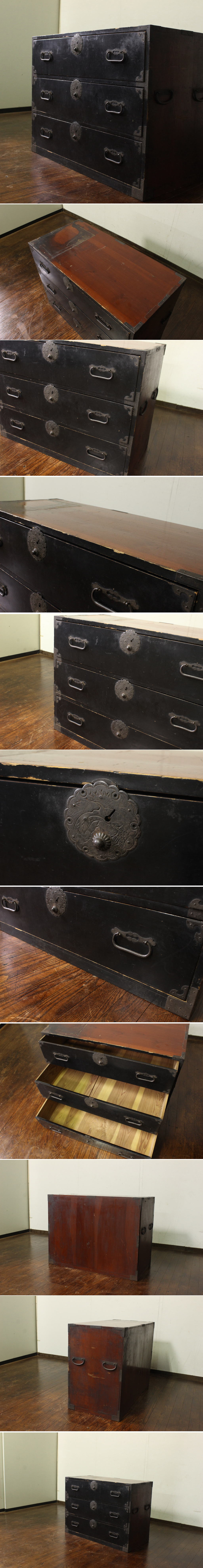 商品紹介 | 古い庄内地方の衣装箪笥です。 特徴的な丸型の錠金具、軍配引手も味があります。 前面は塗膜が褪せて風合いの良い質感です。 使い勝手の良い3杯のレイアウトです。 収納箪笥としての実用にはもちろん、和レトロなアイテムとして ローボードやテレビ台などインテリアにもオススメです。 |