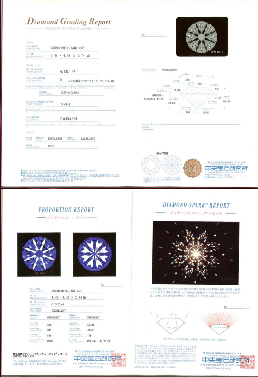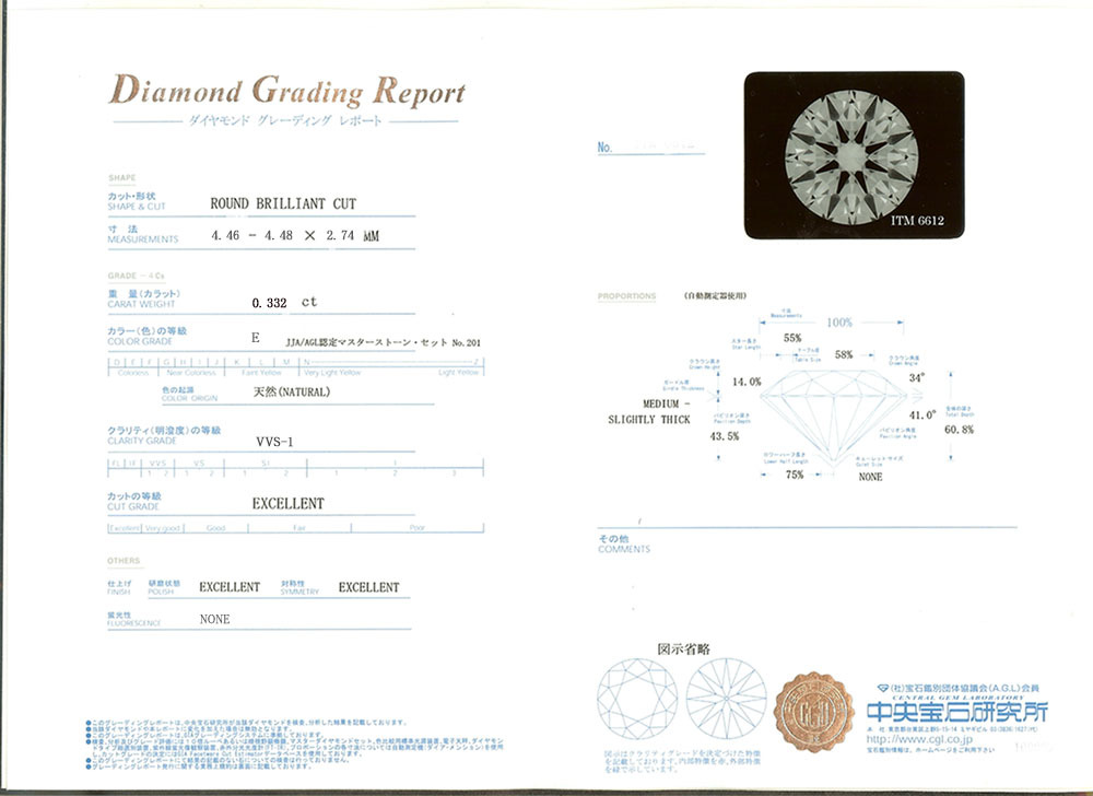 0.332ct カラー:E  クラリティ:VVS-1  カット:3EX H&C  中央宝石研究所鑑定書付