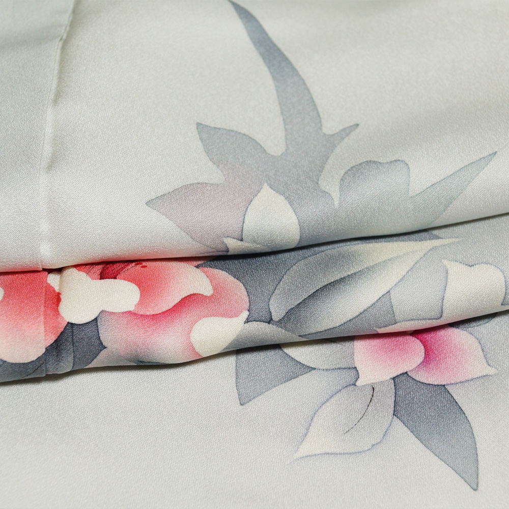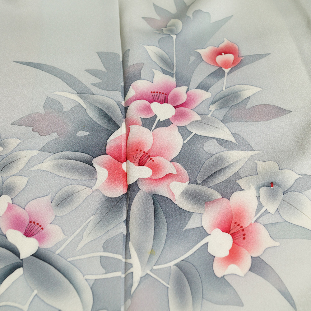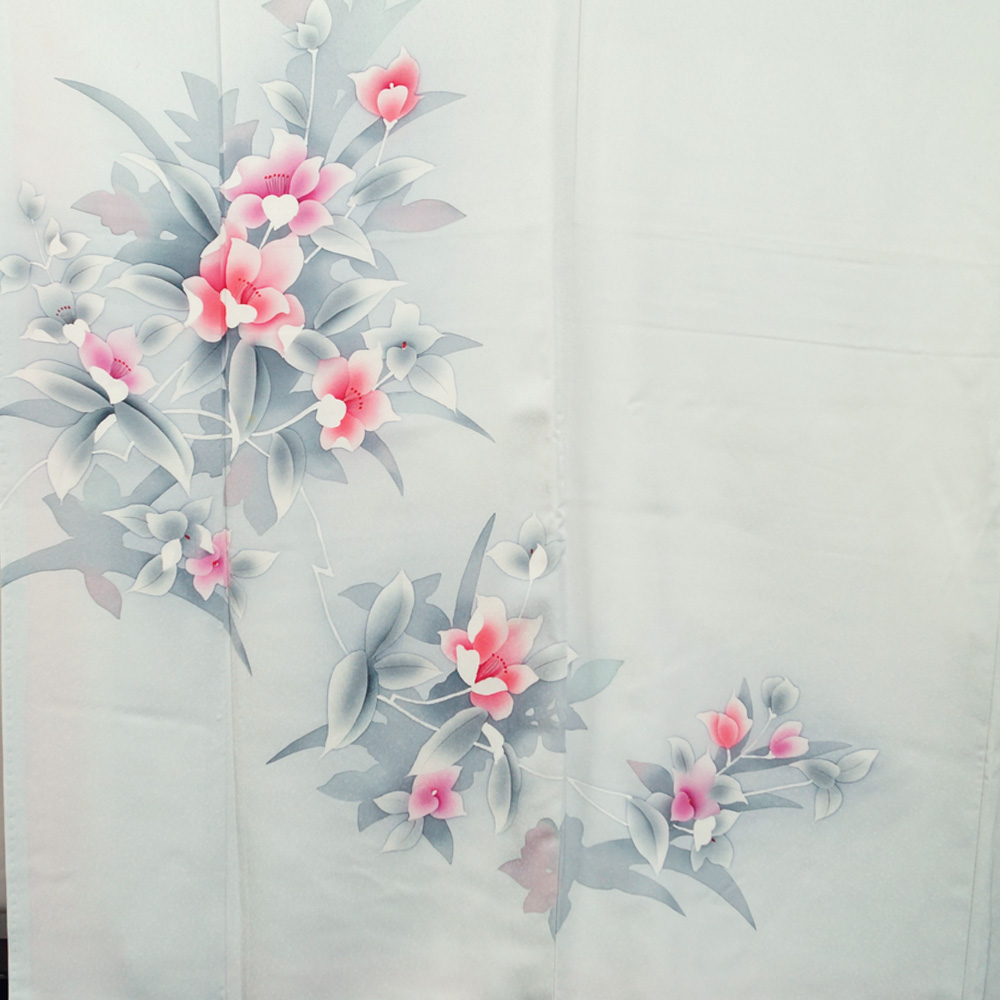 | 商品 説明 | 極薄い水色系の綸子地に洋花模様が染められた付下げ訪問着です。 |