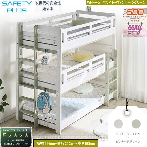 タイトル | 3段ベッド イーニー フラット仕様 送料無料 大人も使える 業務用 耐荷重500㎏構造 分けても使える WH-VG ホワイト ヴィンテージグリーン |