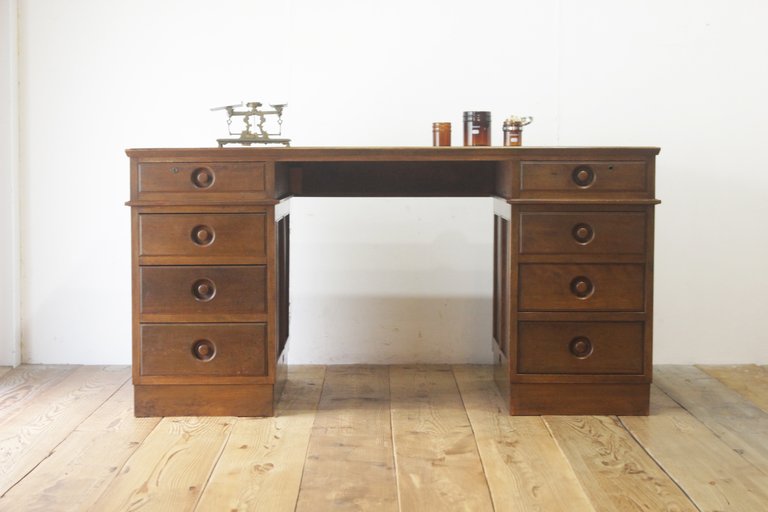 レトロ 両袖デスク 机 書斎 作業台 引き出し 抽斗 8杯 分割可能 木製 古道具 ヴィンテージ/昭和大正英国アンティーク 收藏