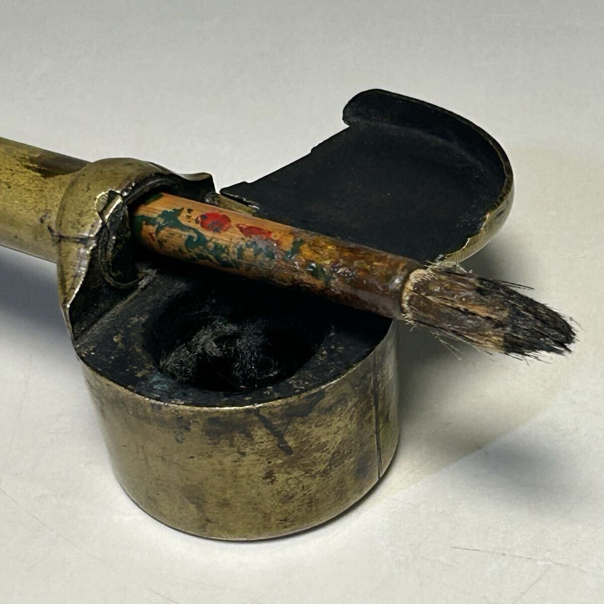 時代書道具 黄銅製 「ヤ」 刻印 矢立 20.6cm おまけ 筆付