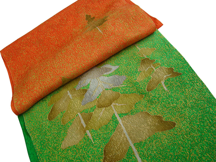 ●帯揚:正絹 しなやかな重めの縮緬地。緑色~朱色地に金のたたき染に金茶の木立柄。