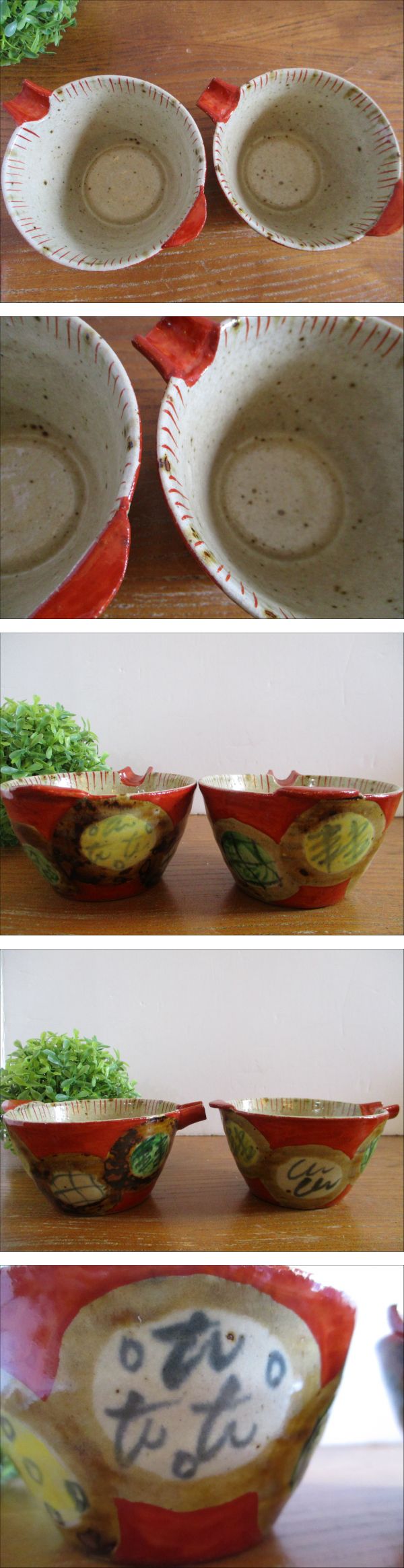 【美品・レア】片口豆鉢 片口 碗 鉢 小鉢 ペア 2個セット 手びねり風 銘あり 柄違い 和食器 和鉢 和風 色絵 陶器 器 希少 | |||