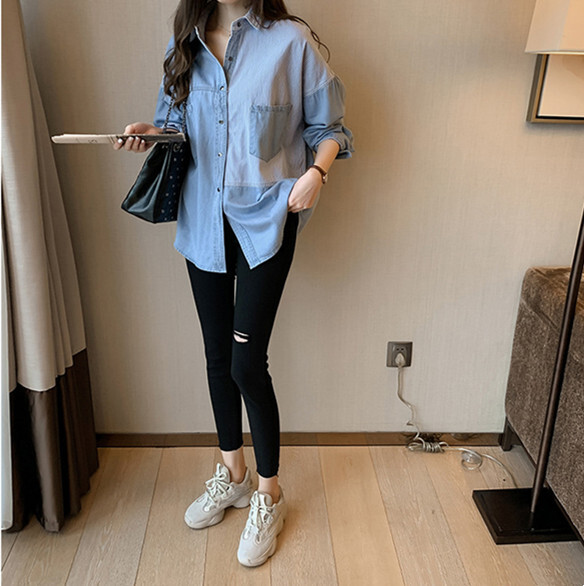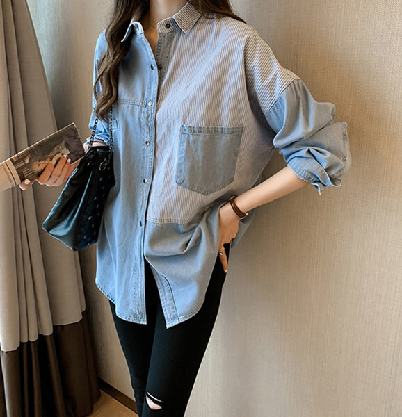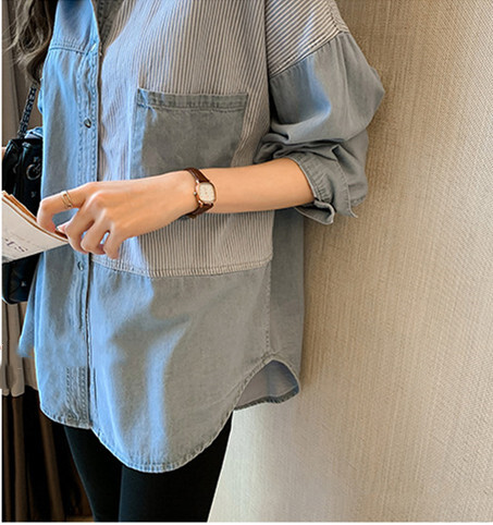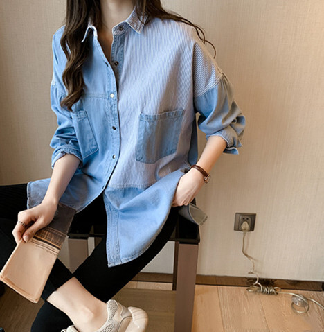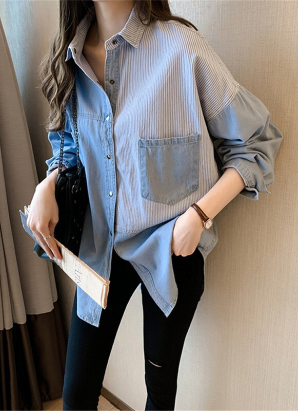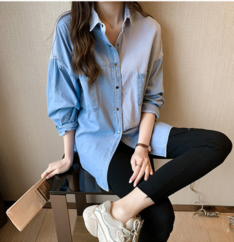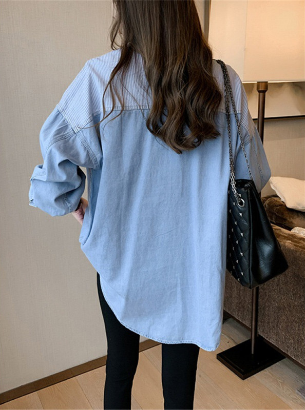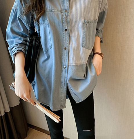 デニムシャツ レディース パッチワーク ウエスタン シャツ トップス 切替え ストライプ ゆったり ライトブルー M 收藏