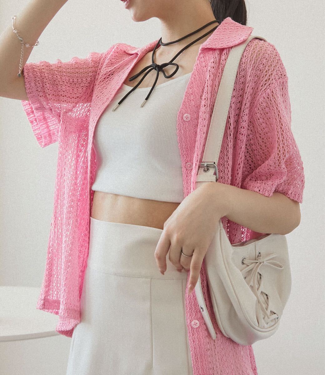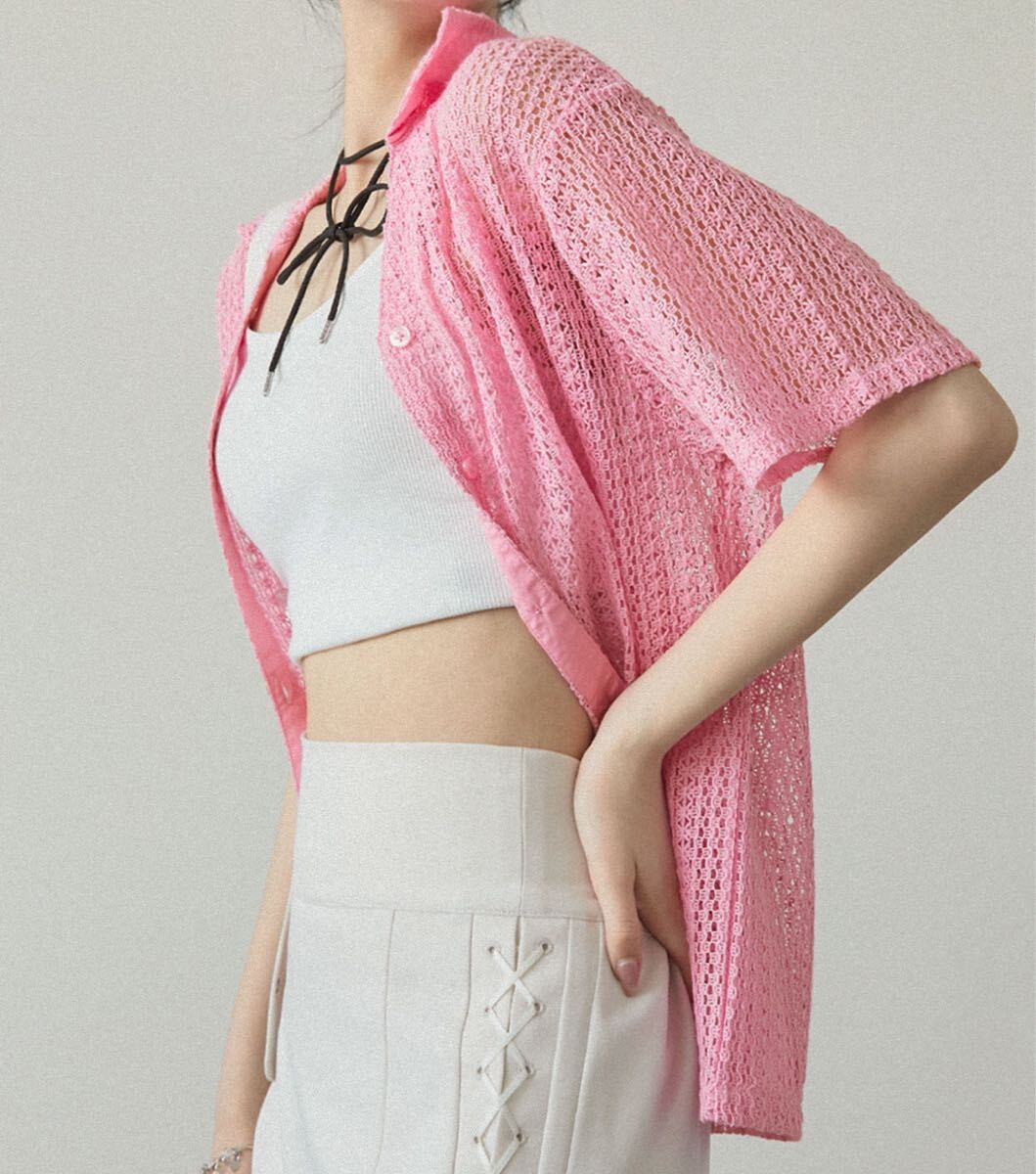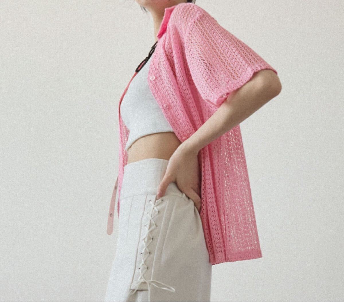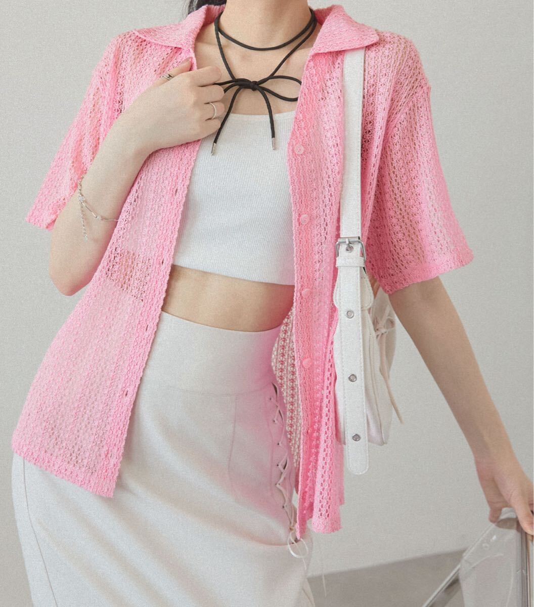新品スキッパーレースシアーシャツ ピンク フリーサイズ 收藏