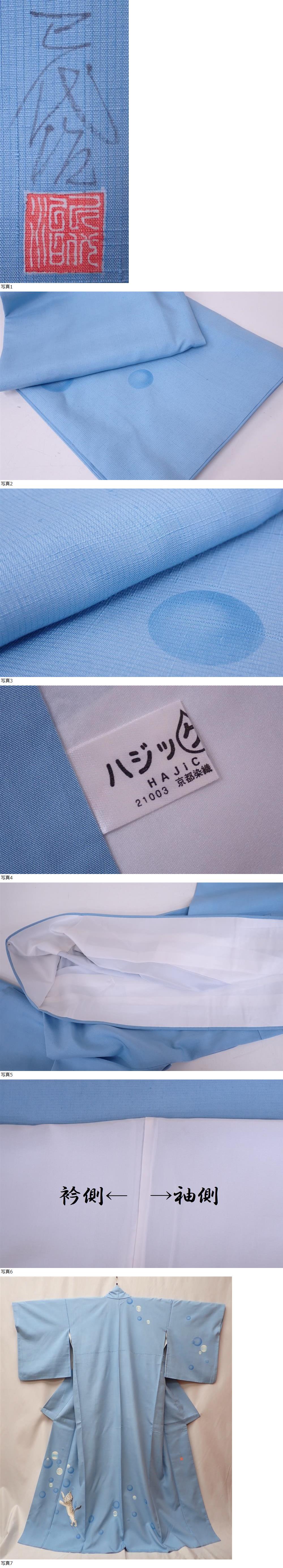 極上品 本加賀友禅作家 石田巳代治 希少柄 シャボン玉 じゃれる猫 紬 165cm(+7cm) 裄丈71cm 水色 逸品 | ||||
