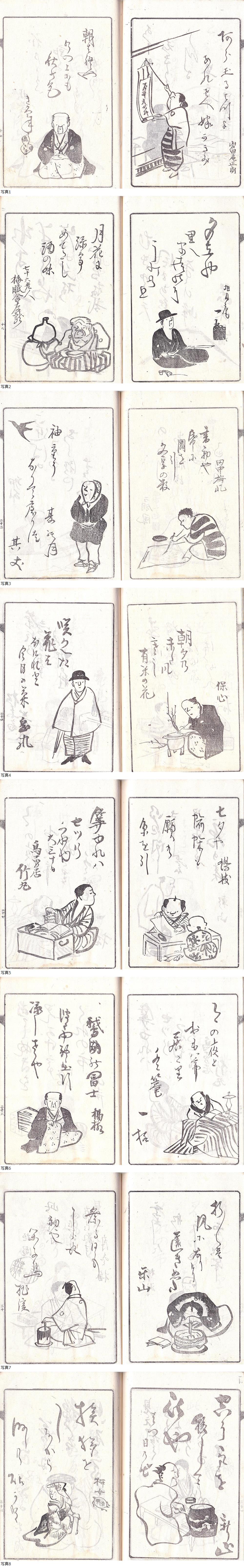 | 文化12年信濃諏訪郡文出村(現諏訪市豊田文出)生 髙島藩士で俳人の久保島若人に師事 嘉永元年眼科医竹内新八の愛人でのち妻となる美智と出奔、2度に渡る諸国巡遊の旅に出、下野を起点に美智の郷里尾張を始め奥州から九州まで幕末の日本全国を巡り各地の大家と交流、俳句とともに京都四条派の岡本豊彦の流派や与謝蕪村・松村月渓らの作品から俳画を習得、また松野由介に楽焼を学び、その作品はエドワード・モースに見出されて米国のボストン美術館の陶器コレクションに収蔵された 長旅を終えて帰郷したのちは、諏訪の風物や人物を題材とした句集・俳画集を出版、軽妙な作品は現在も人々に愛されている また郷土の先人である河合曽良に私淑、追善句会を催し句碑を建立するなど顕彰に勤めた 諏訪一円は元より全国に多数の門人を擁し幕末から明治期の信濃俳壇の隆盛を担った俳人、岩波其残(1815~1894/本姓は山田/幼名は鐵蔵長じて鐵三/別号に喜山,喜全,雪散屋など)撰(実際の編集作業等は門人の楓山,其井が担当)の『まにまに集』全1冊完 明治14年岩波其残跋 橘田春湖序 巻頭に其残画の芭蕉と曽良の肖像を配す 諏訪を中心とする信濃一円の其残門下の俳人百十余名の肖像と代表作を記した画像集 肖像の大部分は其残の手によると思われるが一部本人が俳諧作品とともに描いているものも散見される この時期の信濃俳壇を鳥瞰する好資料 |