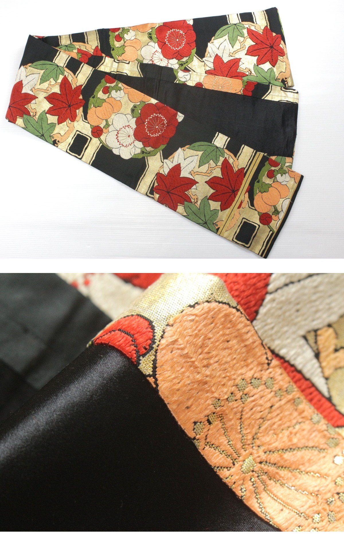 黒地を基調に、色鮮やかな草花文様を大胆に配した、印象的なアンティーク帯のご紹介です。 鮮やかな赤や緑、生成りの色糸が映え、アンティークならではの配色感覚と図案の面白さが存分に感じられる一本となっています。 文様部分には立体感のある織りや刺繍調の表現が用いられ、葉脈や花弁の一つひとつまで丁寧に表現されているのが特徴。 金地との対比によって、柄行がくっきりと浮かび上がり、装いに強い存在感を与えます。 黒無地場との切り替えも効いており、全体の構成にリズムと締まりをもたらしています。 意匠は古典を踏まえつつも、どこかモダンで遊び心があり、アンティーク着物はもちろん、現代の小紋や紬に合わせて個性的なコーディネートを楽しむのもおすすめ。帯を主役にした着こなしに映えるデザインです。 時代を経て受け継がれてきた素材感や風合いも、この帯ならではの魅力。 アンティーク帯特有の味わいと華やかさを楽しめる、コレクション性の高い一条として、ぜひお手元でご堪能ください。 ※撮影時の部屋の照明によって画像の色に若干の差がございます。色味に差がございますことをご了承のうえご検討下さいませ。 …状態… 裏面に擦れ。ほつれあり。 ※全くの新品ではございませんので、記載のない変色やスレ、ヤケ、その他僅かな難がある場合がございます。そのような理由でのキャンセルはお受けできませんので、ご了承の上ご検討お願いいたします。 |