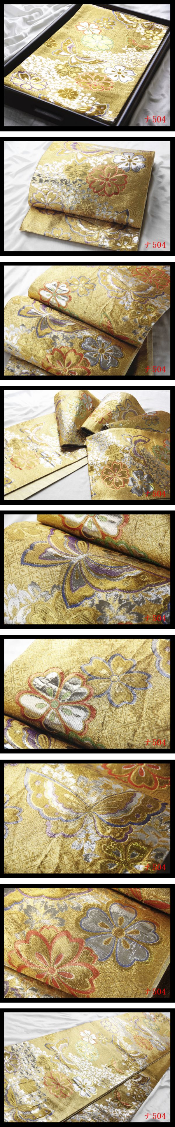 【ナ504】西陣逸品 振袖可 花蝶古典紋 金色地 華やぎの品格 正絹純金糸六通高級美術袋帯 検★着物名古屋帯和装小物帯締め 收藏