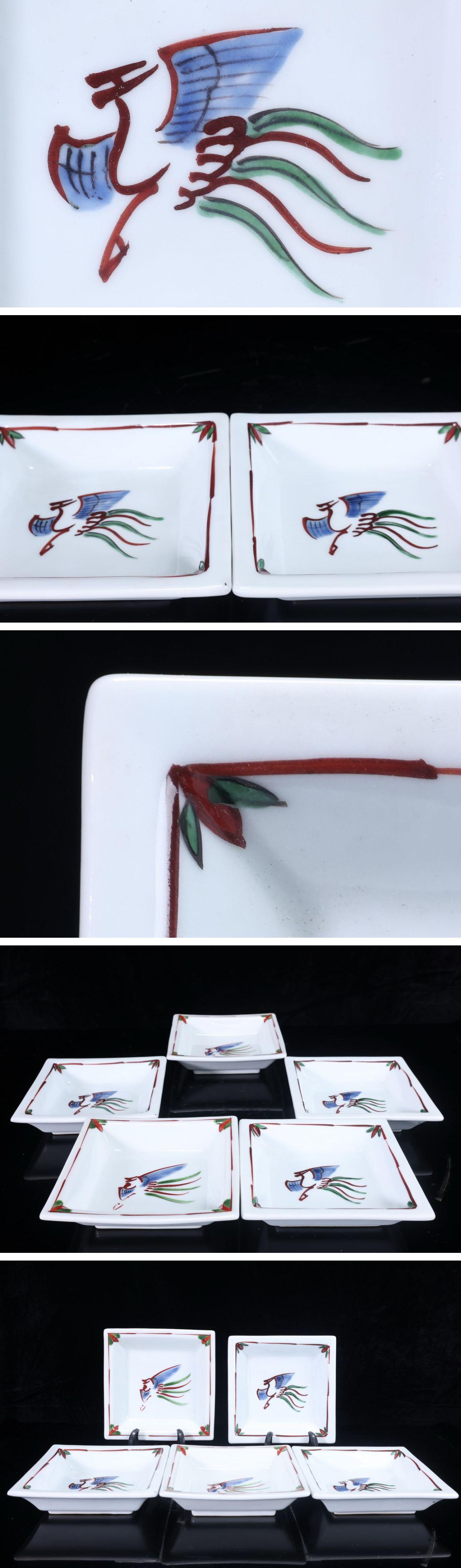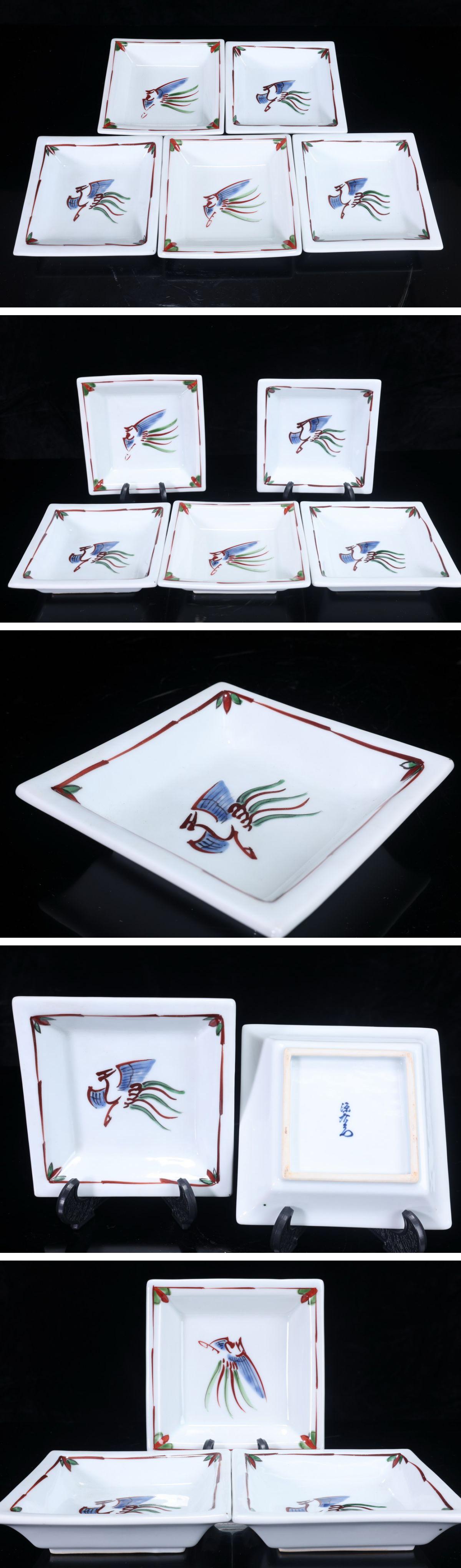【珍品堂】1円から V55-N02 有田焼 源右衛門窯 染錦 赤呉須花鳥 鳳凰 鳥紋 銘々皿 角皿 5枚 径11cm 和食器 時代物 懐石 骨董品 古美術 收藏