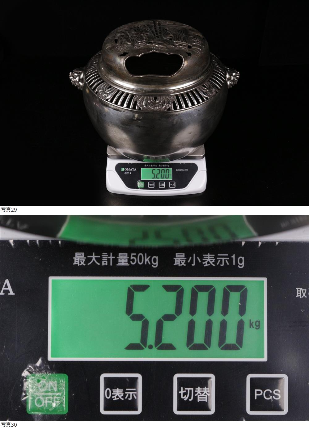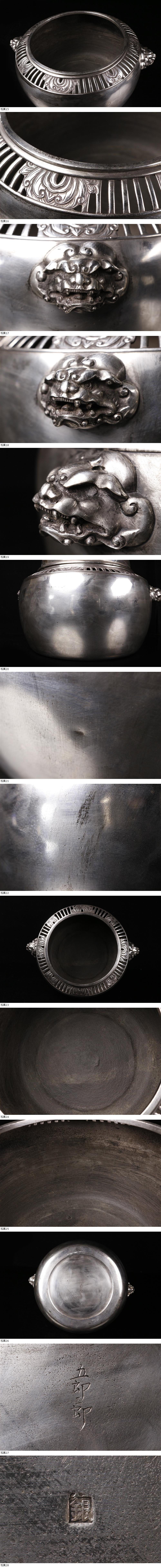 26012310* * * 商品詳細 * * * ここでしか出逢うことのできない唯一の美をご紹介させて頂きます。 メリハリの効いた造形で、精巧で細密な細工が光る手炉のご紹介です。 賢人たちが集まる賑やかな様子が表現されており、 真っすぐに伸びる竹に健やかさと逞しい生命力が伺えます。 胴部分には彫りは施されており、その粗密の差が心地よくも感じられます。 銀色の鈍い輝きが一層の高級感を漂わせる逸品です。 この機会に是非お求めください。 ■商品内容/手炉、箱 ■サイズ/横35cm×高24cm 重量5.200kg 箱:横32.5cm×高32cm ■状態/スレ、キズ、ヘコミ、変色、箱にスレ、キズ、シミ、蓋に歪みがございます。 ※写真にてご確認、ご了承の上ご入札下さい。 銀刻印がありますが銀の成分を保証するものではありません。 ご理解の上ご入札ください。 * * * 支払詳細 * * * !かんたん決済 * * * 発送詳細 * * * 入金確認後3営業日以内に発送致します。 ※直接引き取りも可能です。 60~160サイズにつきましては 佐川急便、ゆうパックのどちらかで発送いたします。 ゆうパック発送の場合、弊社の発送日から追跡サービスに問合せ番号が反映されるまで 約1日ほどお時間がかかりますのでご了承下さい。 * * * 注意事項 * * * 運送中の破損があった場合は速やかに当社までご連絡下さい。 保険を利用するのに受取連絡後に運送会社による現場での破損状況確認が必要となります。 勝手に返送されますと保険の適用外となりますのでご注意ください。 * * * * * * お問い合わせ:082-236-8669 |