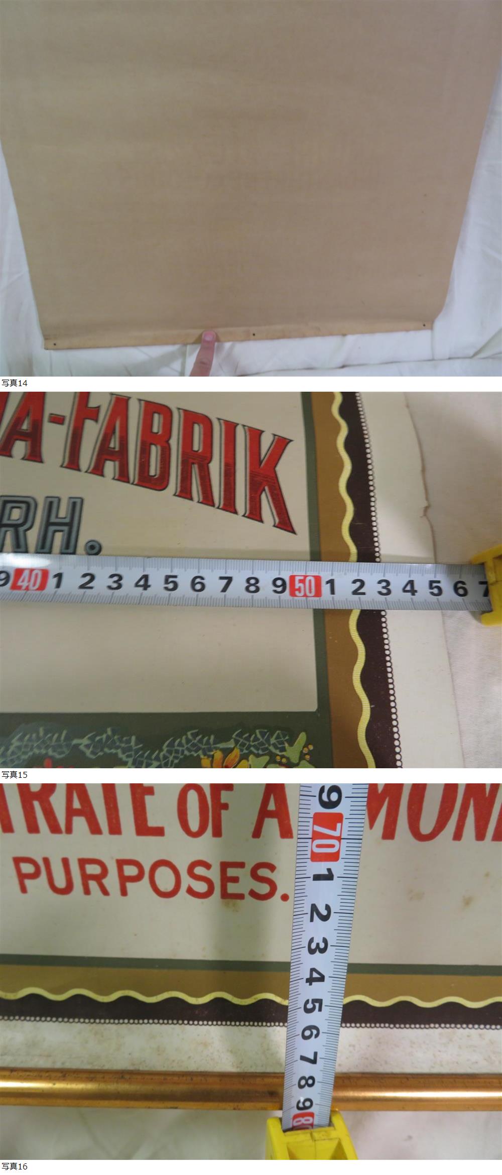 ヴィンテージなドイツの金縁ポスターです。 現状品です。B2ポスターより少し大きいサイズ(写真参照) 1900年頃の染料工場と川沿いでカルトゥーシュのイラストで上下に精巧な金縁取りで囲まれています。 1865年に設立されたバーディシェ・アニリン・ソーダ・ファブリック(BASF)は、かつて世界最大の化学工場でドイツのルートヴィヒスハーフェンに拠点を置き、当初は合成染料の製造に特化していました。重要なブレークスルーは、合成インディゴの工業生産(1897年)とインダンスレン染料の発見(1901年)でした。アニリン染料は、同社の事業の大部分を占めていました。同社は主に、地域および国際的な産業見本市、特に万国博覧会に製品を出品することで宣伝活動を行いました。 ドイツの歴史的な金緑ポスターでドイツのルートヴィヒスハーフェンにある同社の工場と周辺の鳥瞰図が描かれており染料産業の歴史を示す貴重な金縁広告ポスターです。 出版社 バーディシェ・アニリン&ソーダ工場 出版地 ドイツ - ルートヴィヒスハーフェン・アム・ライン 長期保存期間がありポスター下部の包まり、裏側にテープ補修、経年による汚れ等がある事を予めご了承下さい。 サイズが必要な物は写真にてメジャーで縦、幅、奥行き、重量等の分かる範囲で掲載をしてるので、そちらを参考にお願いします。 出来る限り写真の掲載をしております。色々な物を出品しておりますので宜しくお願い致します。 当方が出品してる物でご検討されてる方、気になる事や価格交渉等はオークション開催中に必ずご質問下さい。 基本、即決や価格交渉や配送等の交渉は出来るだけご希望に沿う様にしております。 配送のお手配は(ゆうパック80サイズ)の対応予定です。 ※※※※※※※※※※※※※※※※決済について※※※※※※※※※※※※※※※※※※※ 落札者様の中での決済項目の中に該当しない支払い方法でお願いされる事はありますが落札前にご自身の支払い決済で対応してる物でお願いします。 ※※※※※※※※※※※※※※※※発送について※※※※※※※※※※※※※※※※※※※ 初めに当方が送料の確定、サイズ設定が出来ないのは梱包する事での大きさ、複数の落札をされる方で同梱依頼等がある理由からです。 複数落札される方もおり御品は落札後に梱包しており送料連絡は出来るだけ早めに送っております。また、まとめ依頼等のご連絡は早めにお願いします。 (定形外での配送は破損事故も多く、配送中に破損しても自己責任で納得されない方も多いのでご理解した方のみ定形外での配送を希望されて下さい。) (ゆうパックの1週間や10日間等の長期の時間指定や長期の局留め等の対応は出来かねますので入札前にご検討、または質問した上でお声掛け下さい。ご質問なく長期の局留めをして受け取り連絡をされない方は今後ブラックリスト登録とさせて頂きます。) (ゆうパックで長期不在で受け取りされないで郵便局に御品を長期保管される方、別の他局に変更して尚も長期保管される方、その際に返送になる事は二度手間になり迷惑なのでご自身で時間指定をした上で取引時に必ずご連絡下さい。) 1:当方は郵便局が定めるサイズで配送としております。同日終了の御品で複数落札の方は定形外、レターパック、ゆうパックの最大サイズ以内に収まる物であれば全て同梱の対応としておりますので、複数落札の方は落札後にまとめ依頼の項目で手続きをして下さい。 2:物理的に御品の形によっては同梱が出来ない物も中にはあり、複数発送になる場合の物も中にはありますので予めご了承願います。 3:オークション代行業者様の落札で商品IDの記載をお願いされる場合は予め住所への記載をした上でお返事をお願い致します。 4:ゆうパックで時間指定が必要な方は落札後に取引メッセージでお伝え願います。(例:12時~14時等)レターパックに日時指定はありません。 5:定形外の特定記録、ゆうパケット、海外発送等は対応しません。またオークション期間中に何の質問もなしに落札後に定形外での梱包や送料についての自分ルールの様な細かい要求は対応しません。 6:定形外は全て規格外配送(御品によって規格内)としております。 ※※※※※※※※※※※※※※※※出品してる物について※※※※※※※※※※※※※※※ 目に見える範囲のキズ等は明記、写真でも掲載いたしますが、出品物は未開封、未使用、骨董品、中古、ジャンクで出品してる物によっては説明しきれない時代物の汚れ、スレ、変色、使用。小キズ等の欠点も中にはあります。 そういった経年の欠点を気になさる方、神経質な方は最初から入札をなさらない方が良いかと思われます。 出品してる物の時代感、状態も含めて大事にして頂けてご了承をした方のご入札をお待ちしております。 商品の状態等 未使用、未開封、良品、美品、極美品、中古、ジャンク、真贋不詳、本物保証が出来る物(絵画、版画等の色々と鑑定が必要な物)は商品説明に記載します。